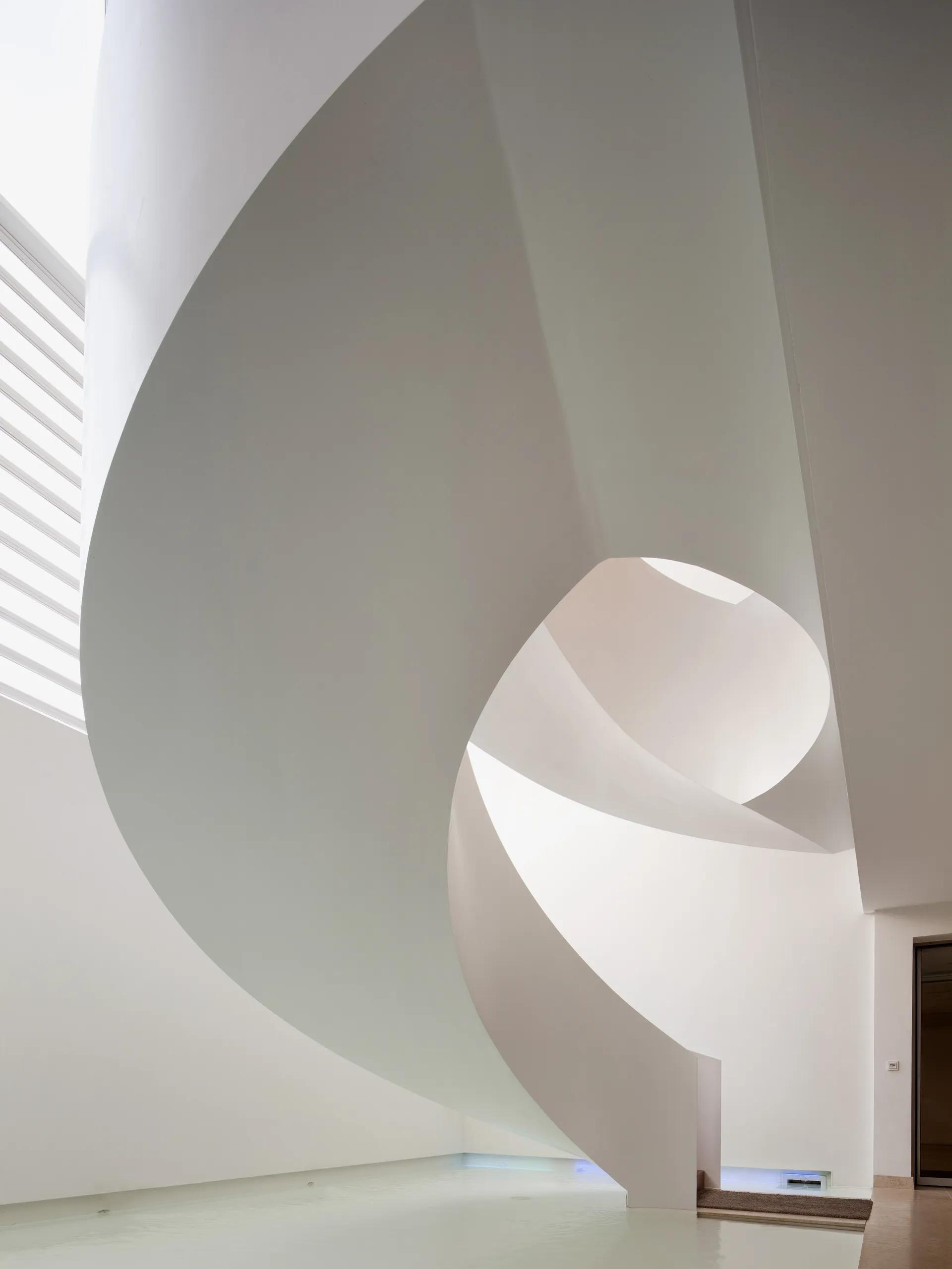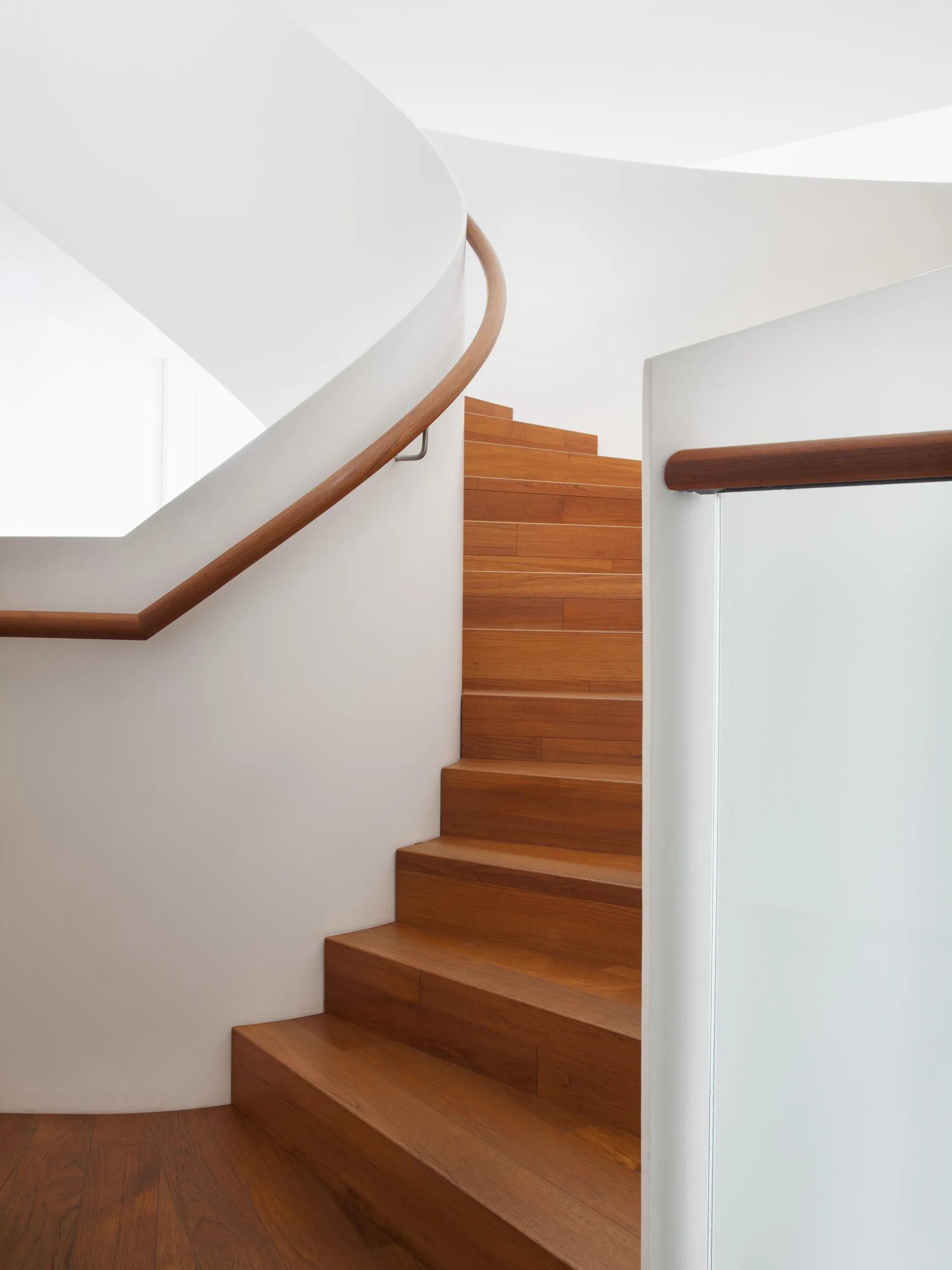At the Seehotel Riva in Constance, these extravagant staircases boast an exclusive design. Premium-class staircase architecture that impresses with its sophisticated design alone. The technical and design challenge has been excellently implemented: elliptically curved flat steel balustrade stringers with a white lacquered surface create a harmonious contrast to the elegant wooden covering of the folded steps. Another highlight is the steel soffit lining of the spiral stairs, which is curved to follow the course of the stairs. With an interplay of geometry, material and light, these self-supporting stairs impress above all with the harmony of steel and wood.