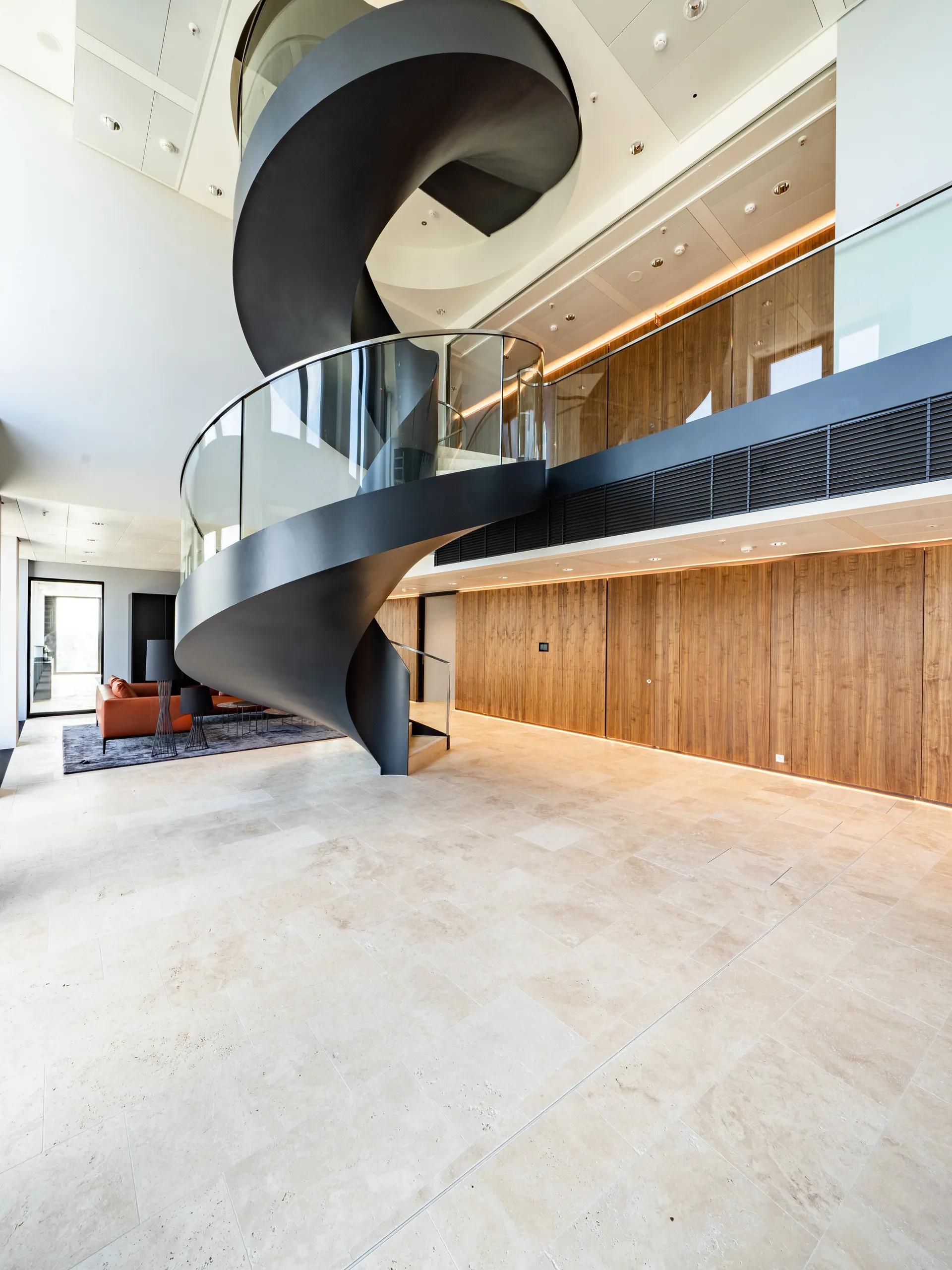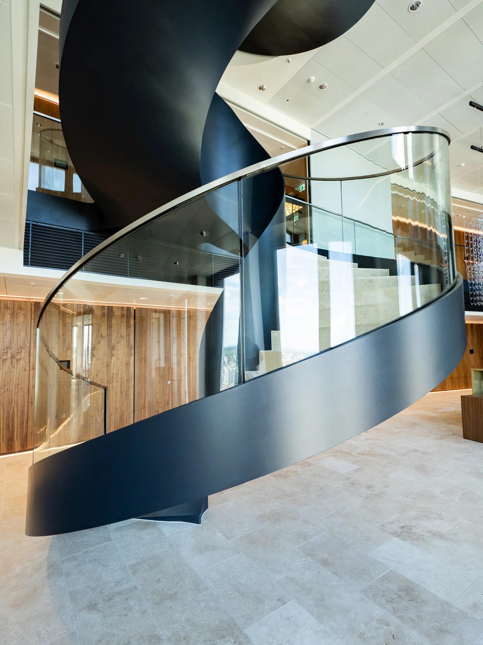 - On floors 23-27, a stylish steel staircase with evenly rounded and straight-running components connects the floors. A paling balustrade with an oiled American walnut handrail rounds off the construction. In addition to the services already listed, METALLART was responsible for the verifiable structural analysis of the stairs, the paling balustrade and the all-glass railings for the spiral staircase.