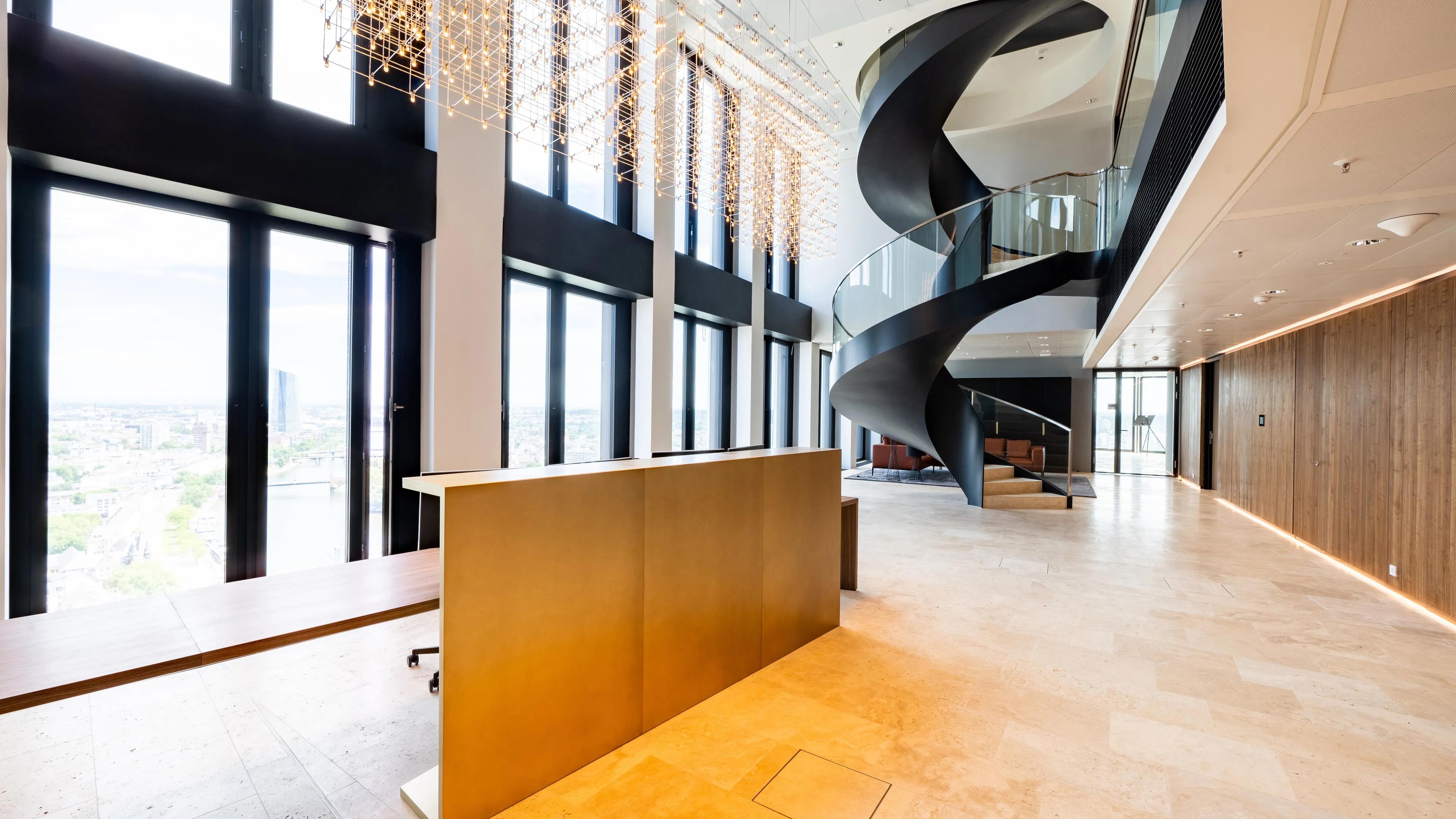Susanne Klatten, the richest woman in Germany, purchased the entire building before its completion in 2019. Much of the office space has since been let. In 2020, the global law firm DLA Piper moved into its new premises on floors 23 to 27 and the roof terrace on the 28th floor of the building. We were able to manufacture two exclusive staircases for the renowned law firm.