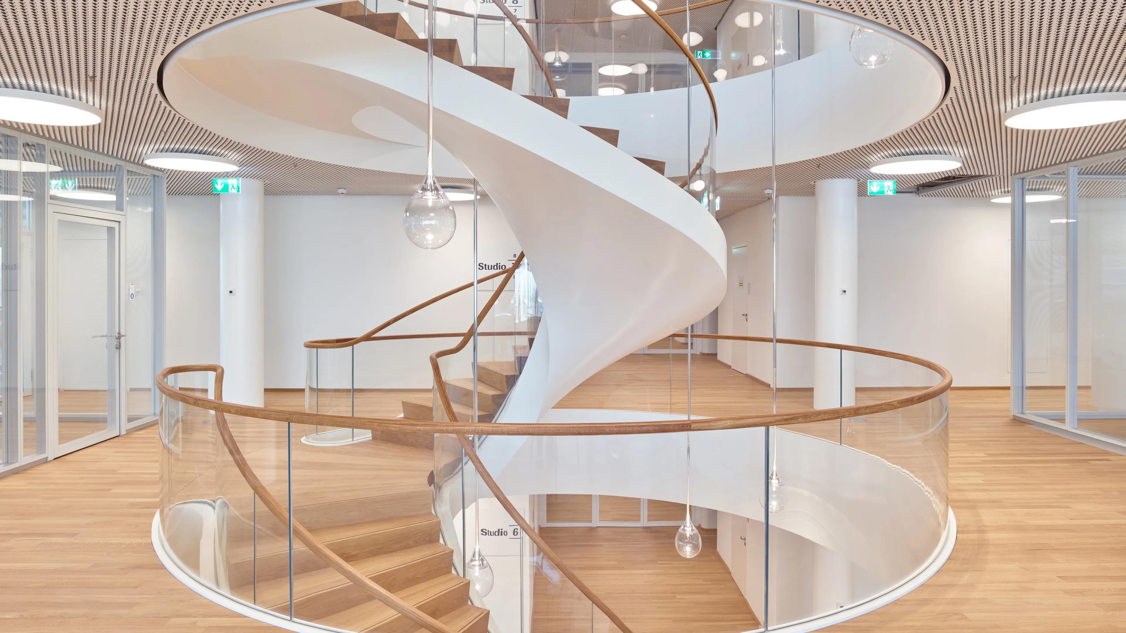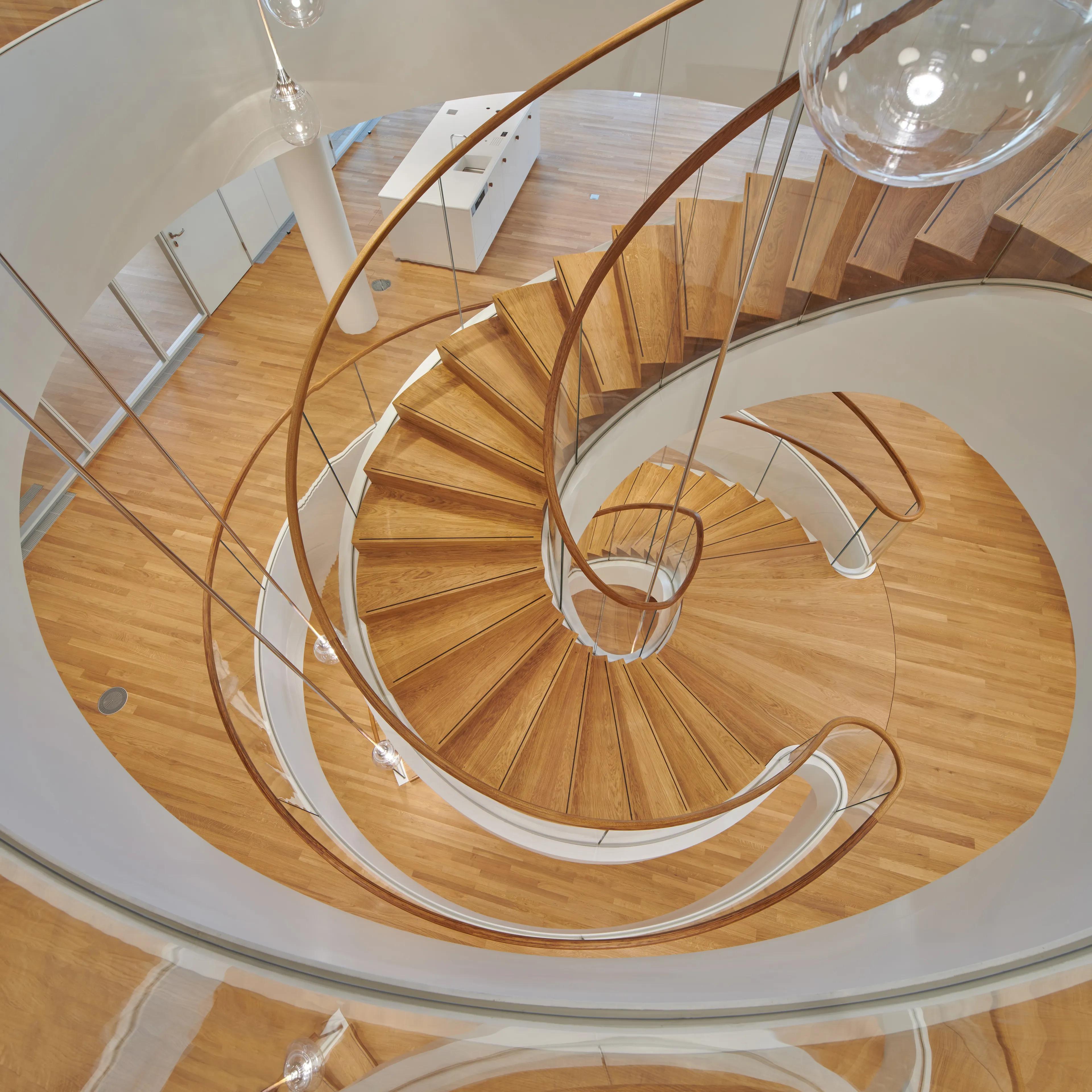 Das Siegerobjekt im neuen Bürohochhaus der F. Hoffmann-La Roche AG am Stammsitz in Basel erstreckt sich über 45 der insgesamt 50 Stockwerke des mit 205 Metern höchsten Gebäudes der Schweiz. Die Anlage besteht aus 16 hochkomplex konstruierten Wendeltreppen in sechs verschiedenen Ausführungen, die sich in Geschosshöhe, Laufbreite, Steigungsanzahl und Treppenteilung unterscheiden. Beidseitig verlaufen brüstungshohe