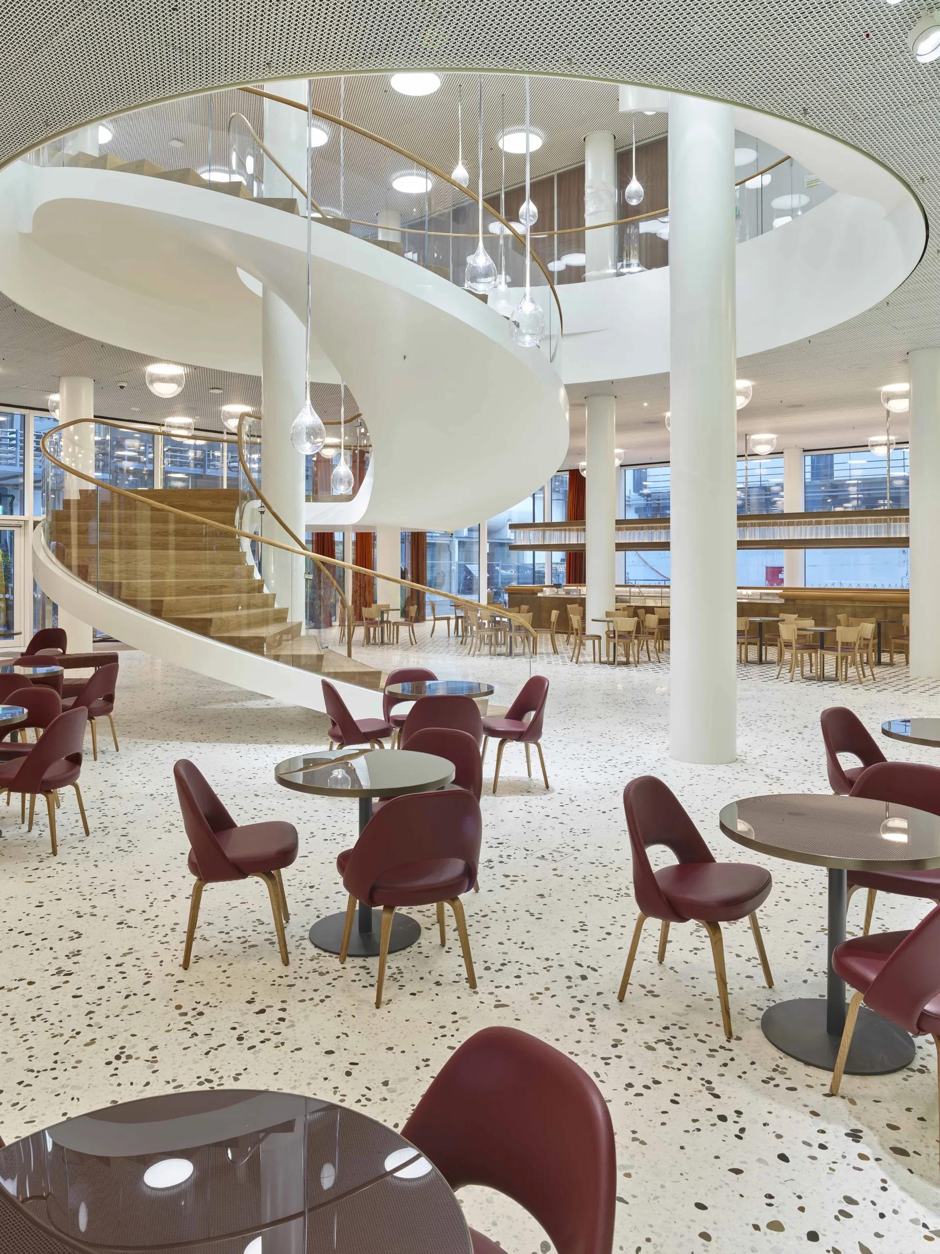 Die anspruchsvoll konstruierten Stahlwendeltreppen im Neubau des Bürohochhauses von Roche bilden ein gelungenes Ensemble aus Stahl und Glas.