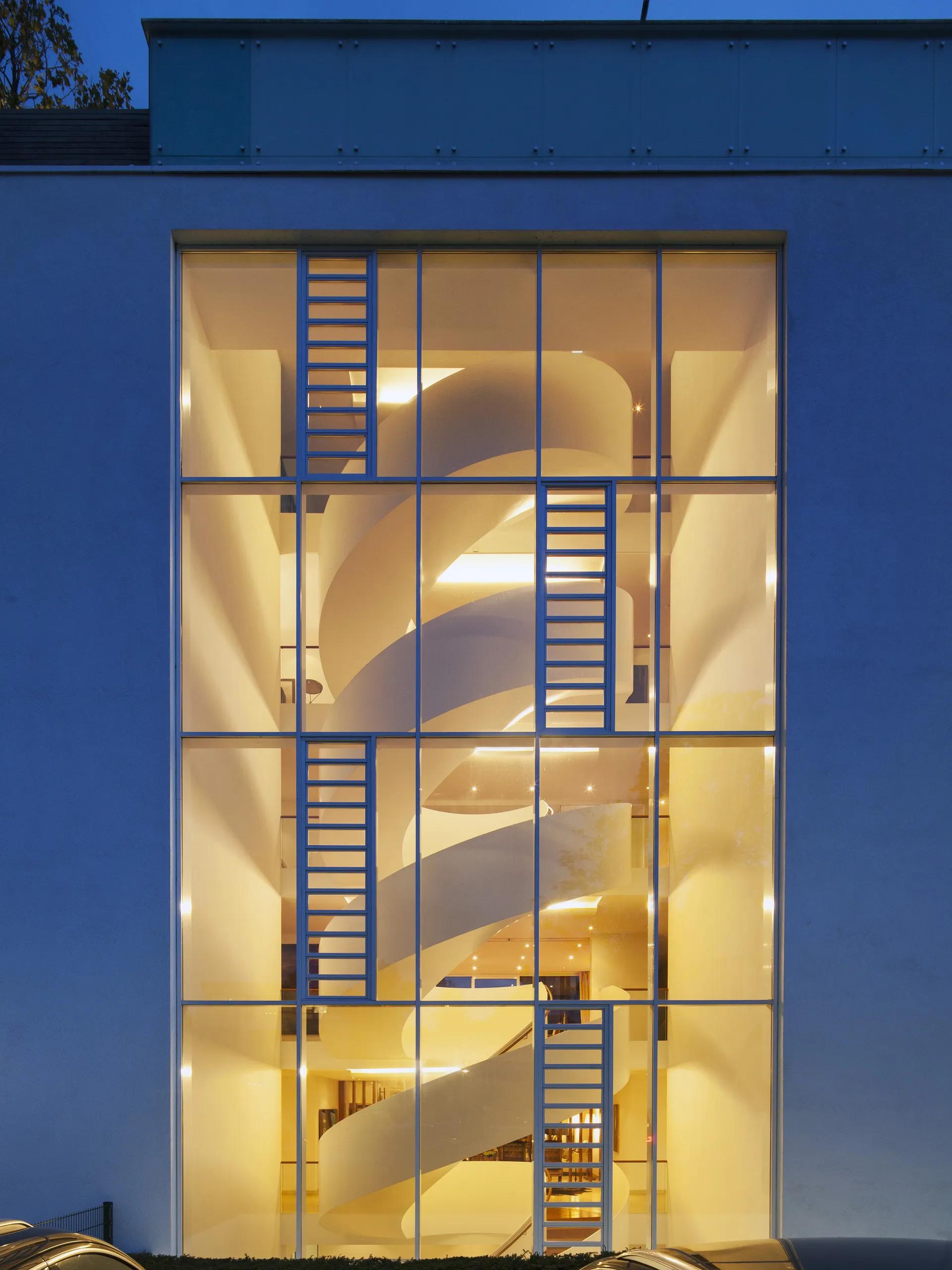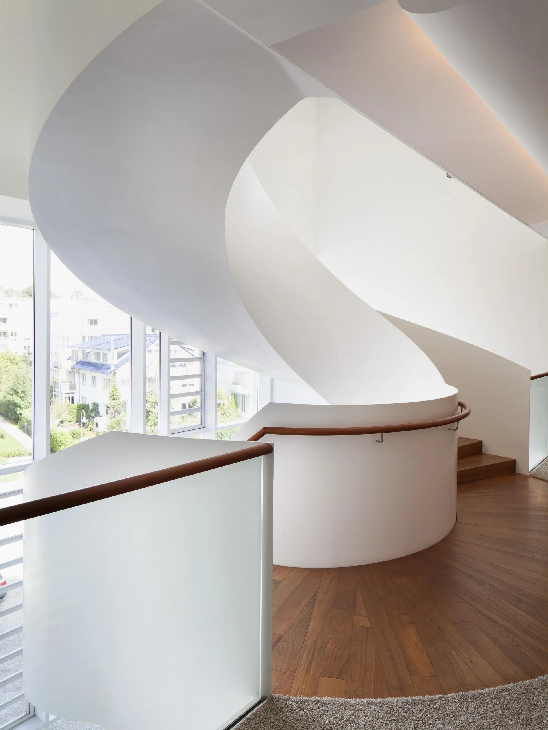 Treppen-Architektur der Premiumklasse, die schon allein durch die anspruchsvolle Formgebung beeindruckt. Mit einem Spiel aus Geometrie, Material und Licht überzeugen diese freitragenden Treppen vor allem durch die Harmonie von Stahl und Holz.