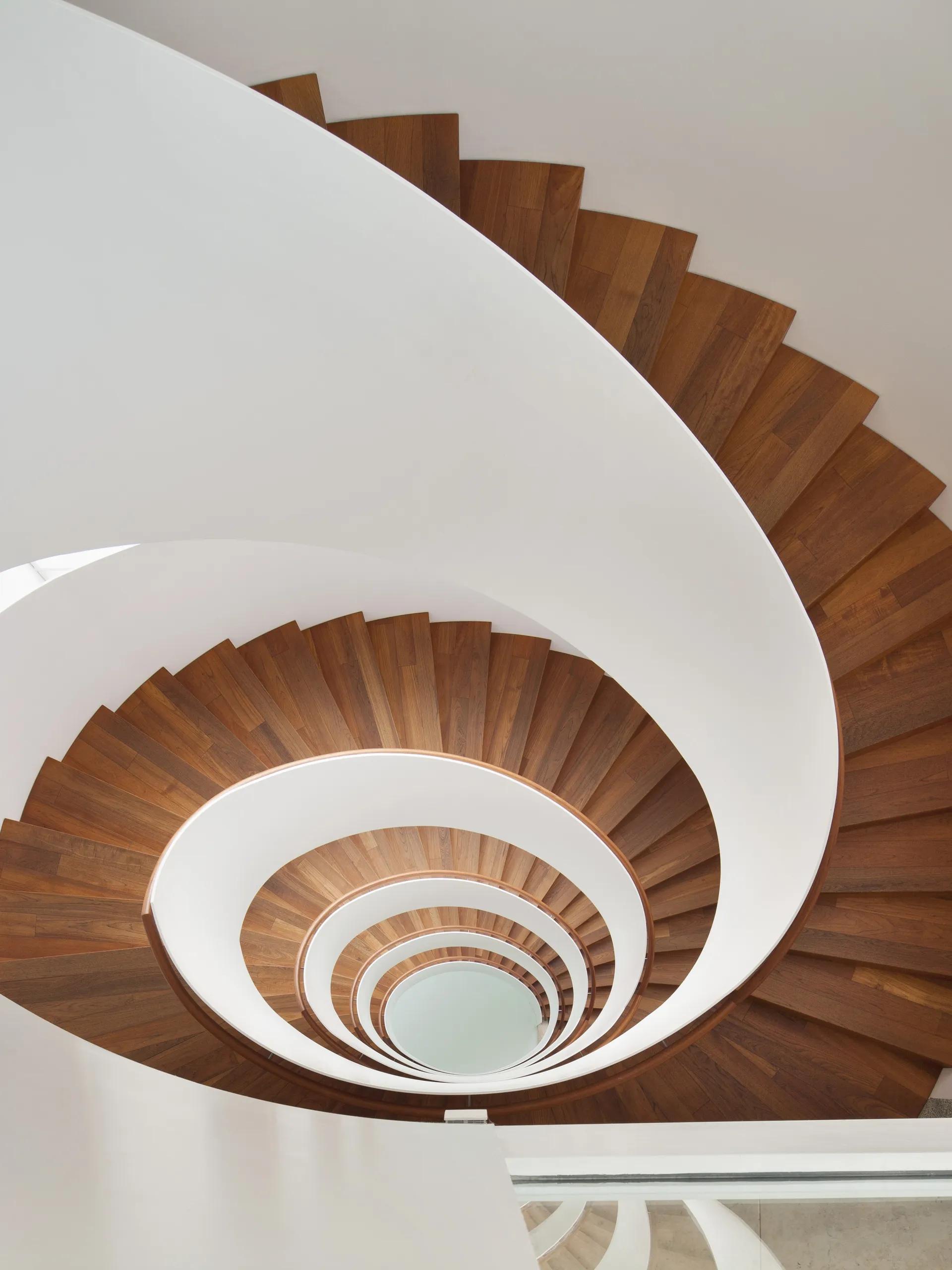 Im Seehotel Riva in Konstanz präsentieren sich diese extravaganten Treppen in exklusivem Design. Treppen-Architektur der Premiumklasse, die schon allein durch die anspruchsvolle Formgebung beeindruckt. Die Herausforderung an Technik und Design wurde exzellent umgesetzt: ellipsenförmig gebogene Flachstahl-Brüstungswangen, die durch ihre weiss lackierte Oberfläche einen harmonischen Kontrast zum edlen Teak-Holzbelag der Faltwerkstufen bilden. Ein weiteres Highlight bildet die dem Treppenverlauf entsprechend gebogene Untersichtsverkleidung der Wendeltreppe. Mit einem Spiel aus Geometrie, Material und Licht überzeugen diese freitragenden Treppen vor allem durch die Harmonie von Stahl und Holz.