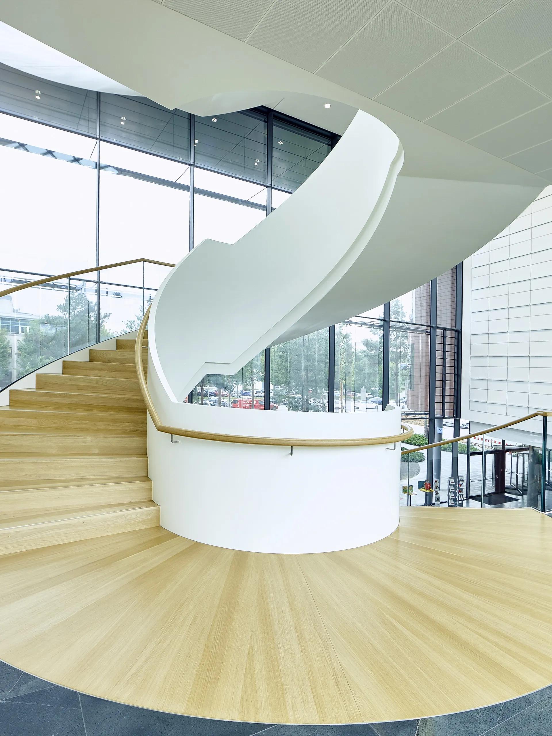 Unser Partnerunternehmen für die Stufen- und Podestbeläge sowie den steigend gebogenen Handlauf war die Schreinerei HolzHacker aus Göppingen.