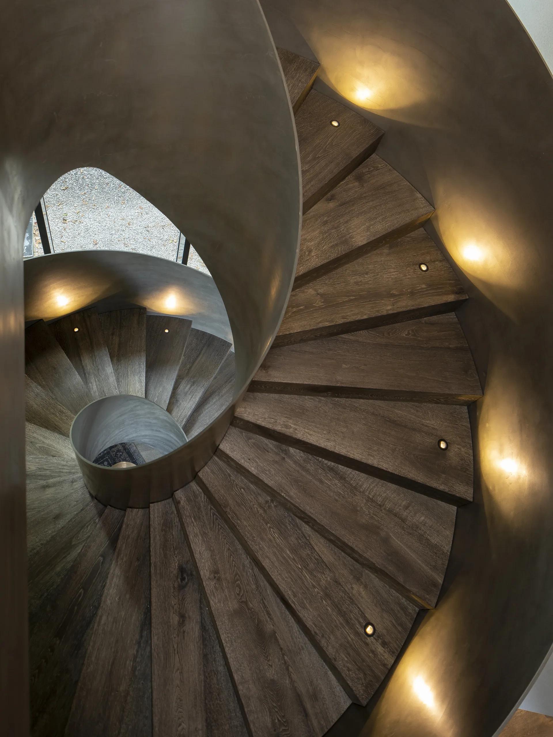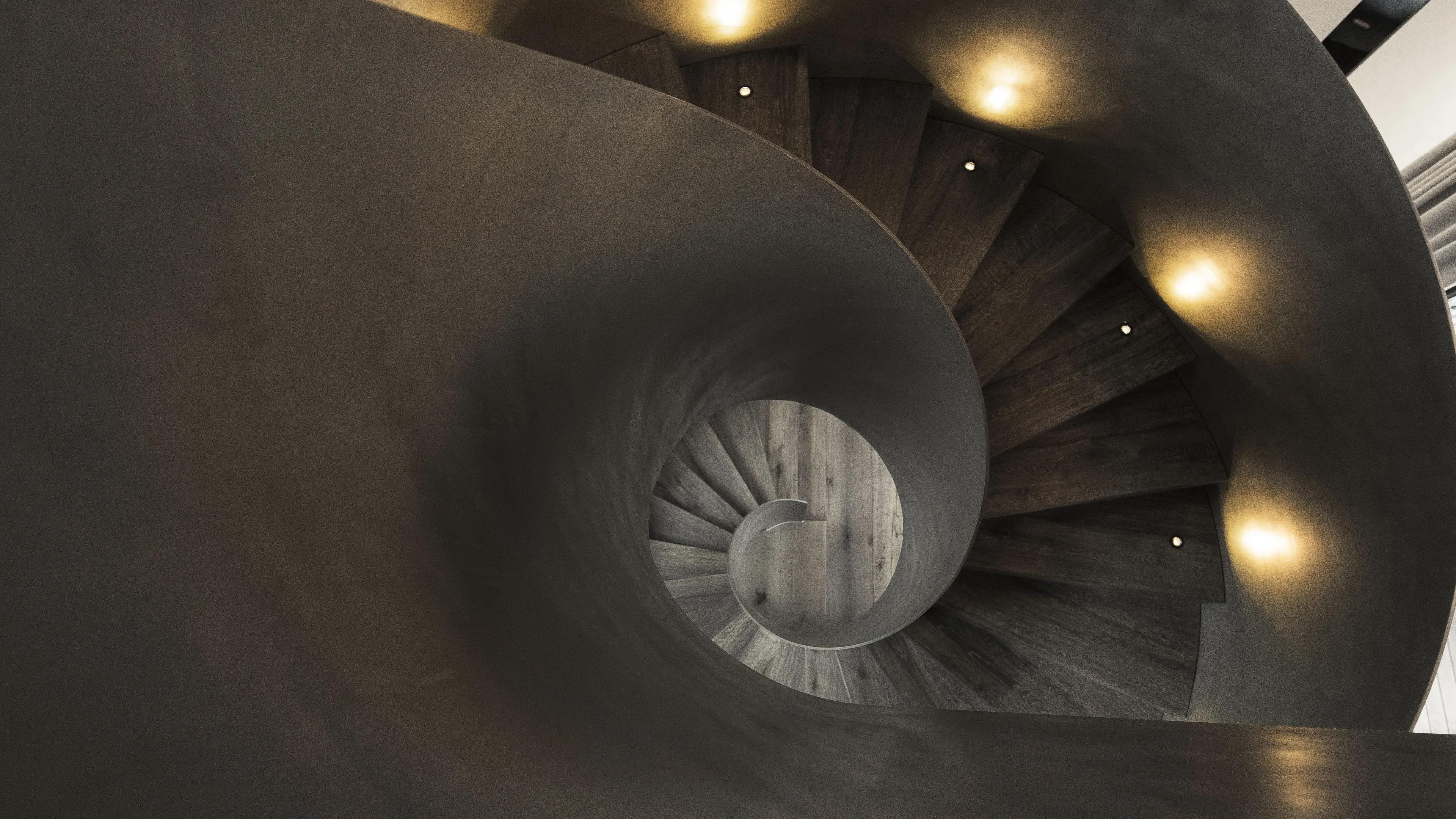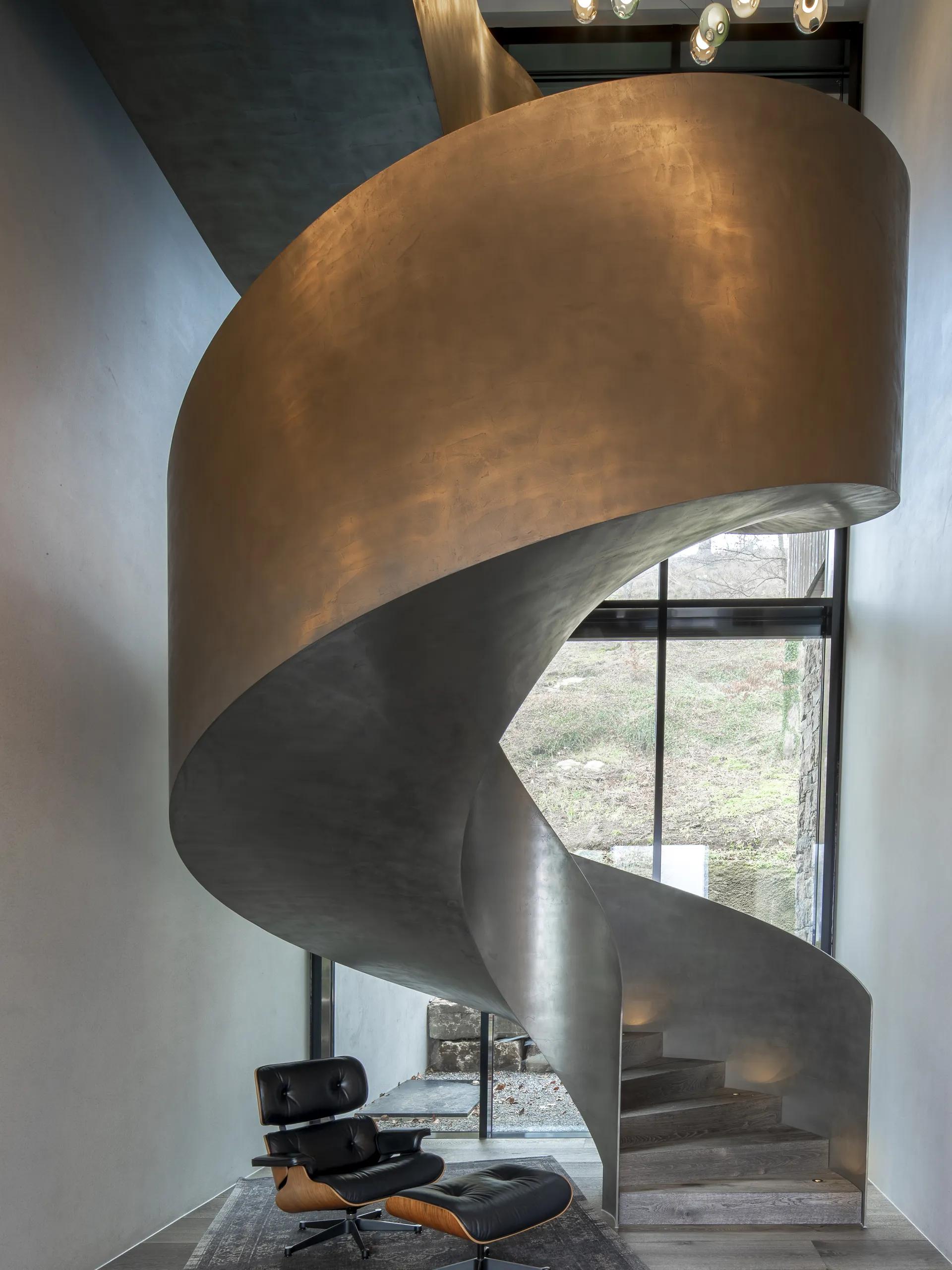 Zwischen Erdgeschoss und oberem Stockwerk fügt sich die Stahltreppe als zentrales Verbindungselement ins stilvolle Wohnambiente ein. Mit eineinhalb gleichmässigen Umdrehungen führt die gerundete Treppenkonstruktion nach oben und endet in einem geraden Steg im Obergeschoss. Die Stufenkonstruktion ist geschlossen als Faltwerk ausgeführt. Zum skulpturalen Charakter der Wangentreppe mit Stahlbrüstung trägt die glattflächige Untersichtsverkleidung bei, die entsprechend dem Treppenlauf exakt zwischen die Wangen eingeschweisst wurde. Dieses Designelement wurde mit der gesamten Wangentreppe mit Stahlbrüstung mit einer bauseits aufgebrachten Flüssigmetallbeschichtung veredelt und erhält dadurch eine vollkommen nahtlose und homogene Oberflächenoptik.