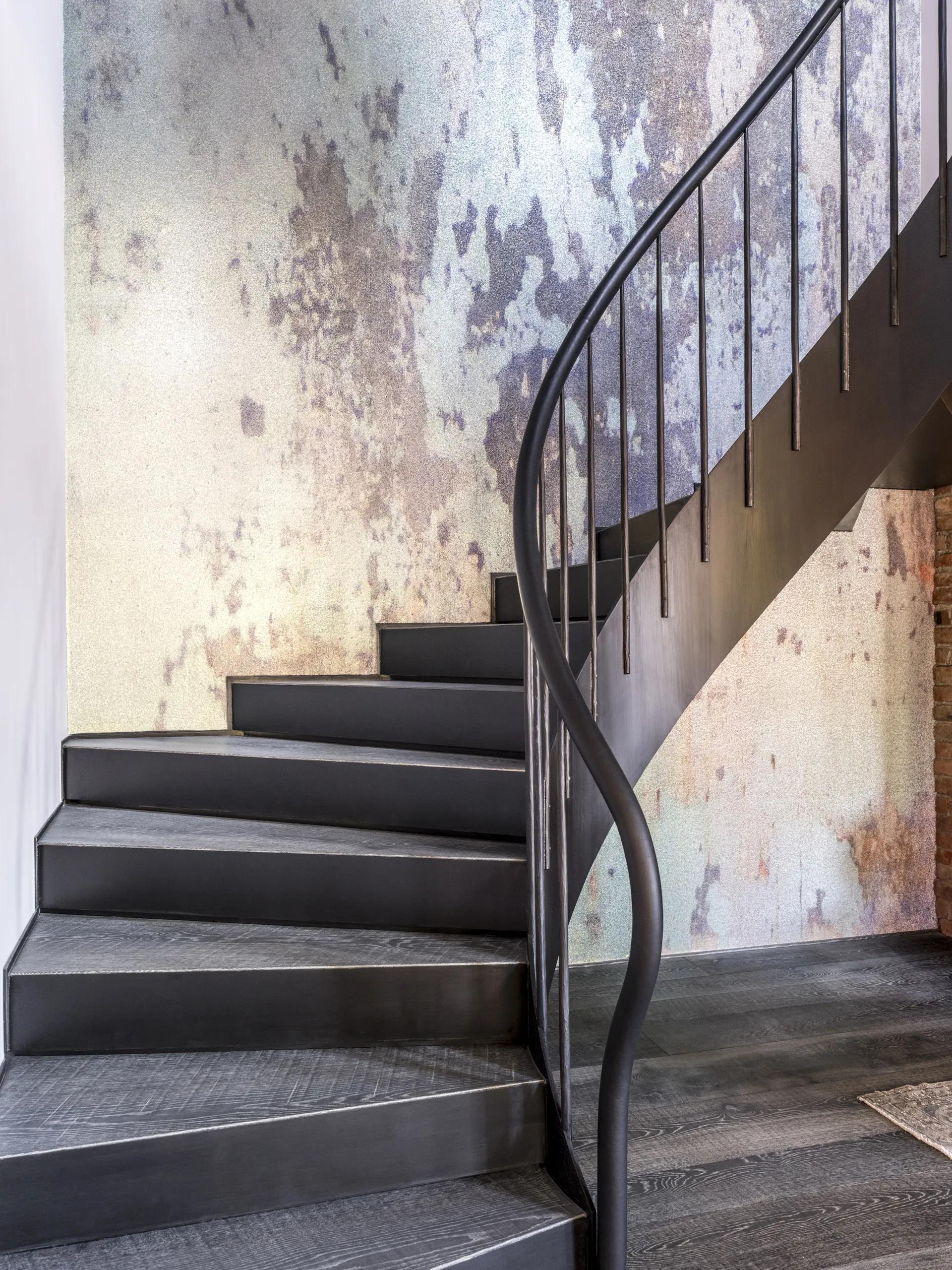 Die Rohstahl-Elemente der Wohnhaustreppe erhielten, abgestimmt auf den Farbton des Stufenbelags aus Eichenholz, ein brüniertes Finish, das an der Untersicht konsequent weitergeführt wurde. Durch den freien Blick auf das Faltwerk aus gekantetem Flachstahl und die bewussten Unregelmässigkeiten des Rohstahls entstand einzigartig authentisches Treppendesign. Das gewünschte indirekte Beleuchtungskonzept für die Wohnhaustreppe konnte anhand von Bohrungen zur Kabelführung und einer an der Stufenunterseite konstruierten Lichtvoute ausgeführt werden.