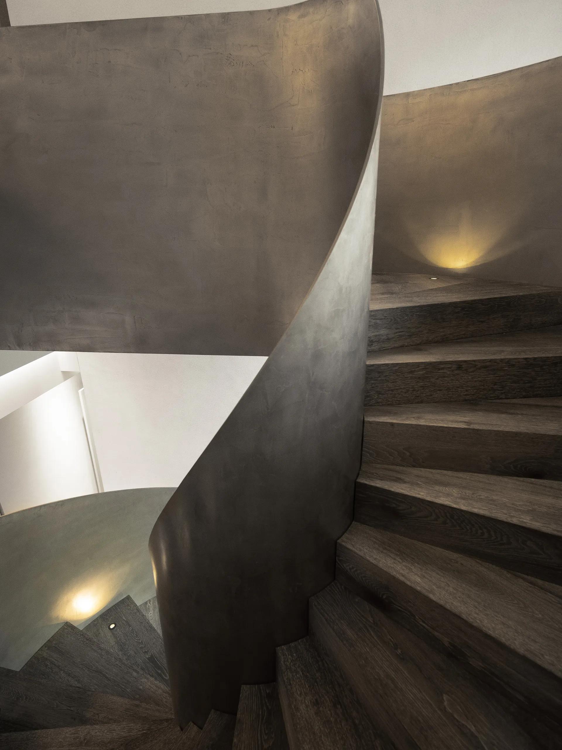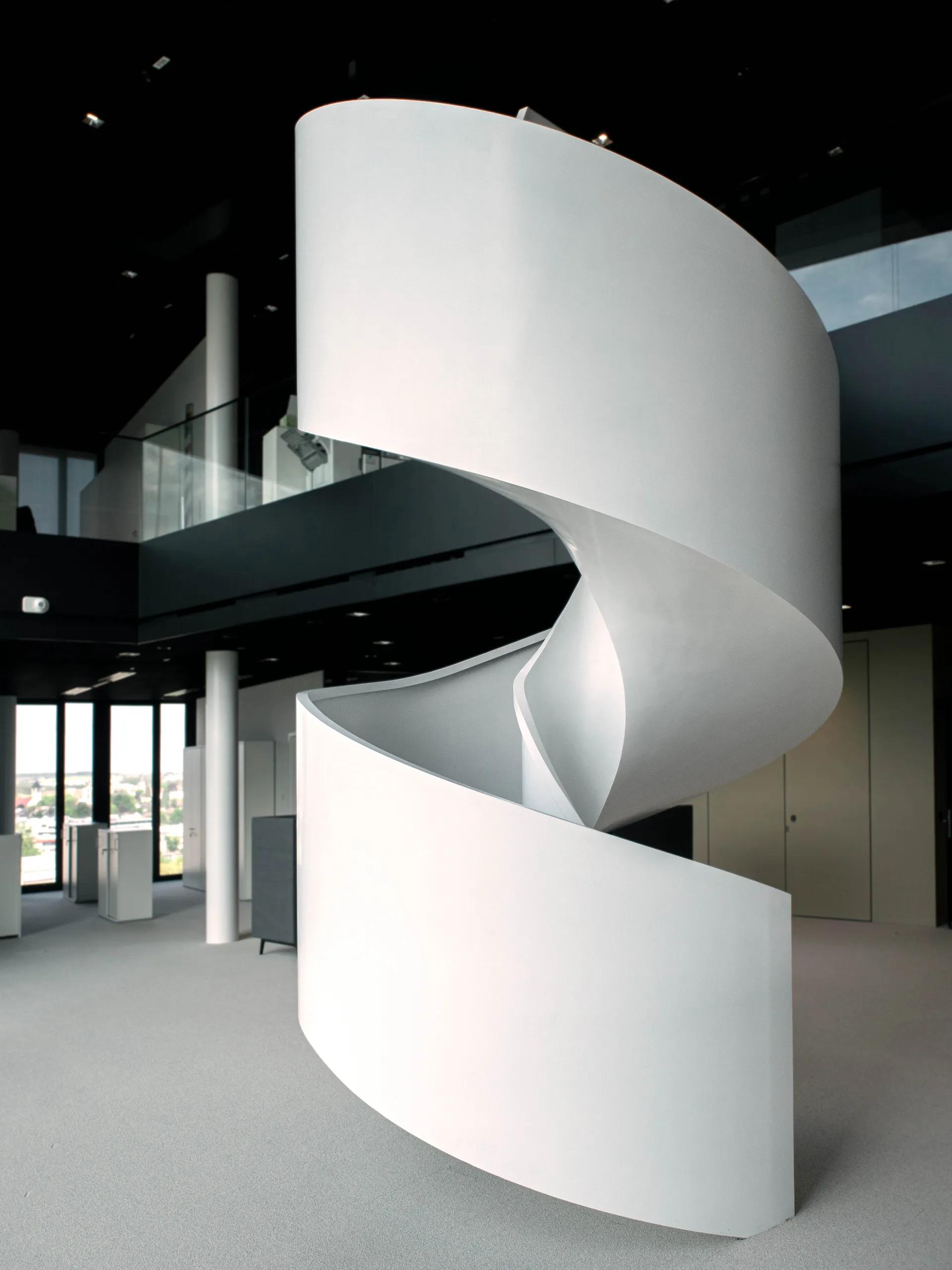 Eine geschlossene glattflächige Untersichtsverkleidung gilt letztendlich als Designelement der modernen Architektur und wird entsprechend dem Verlauf zwischen den Wangen eingeschweißt. Besonders bei gebogenen Stahlwangentreppen erreicht man dadurch einen geradezu skulpturalen Charakter.