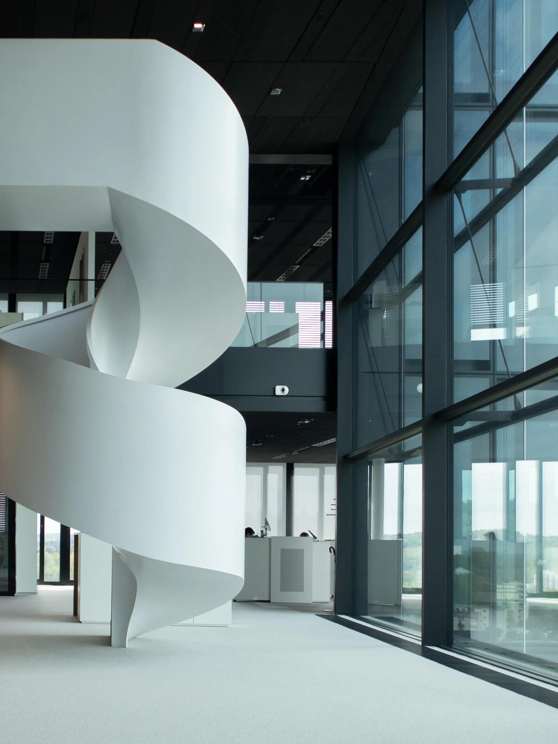 Die sieben baugleichen Skulpturtreppen setzen faszinierende Akzente in der neuen Firmenzentrale des Globalplayers BITZER in Sindelfingen.