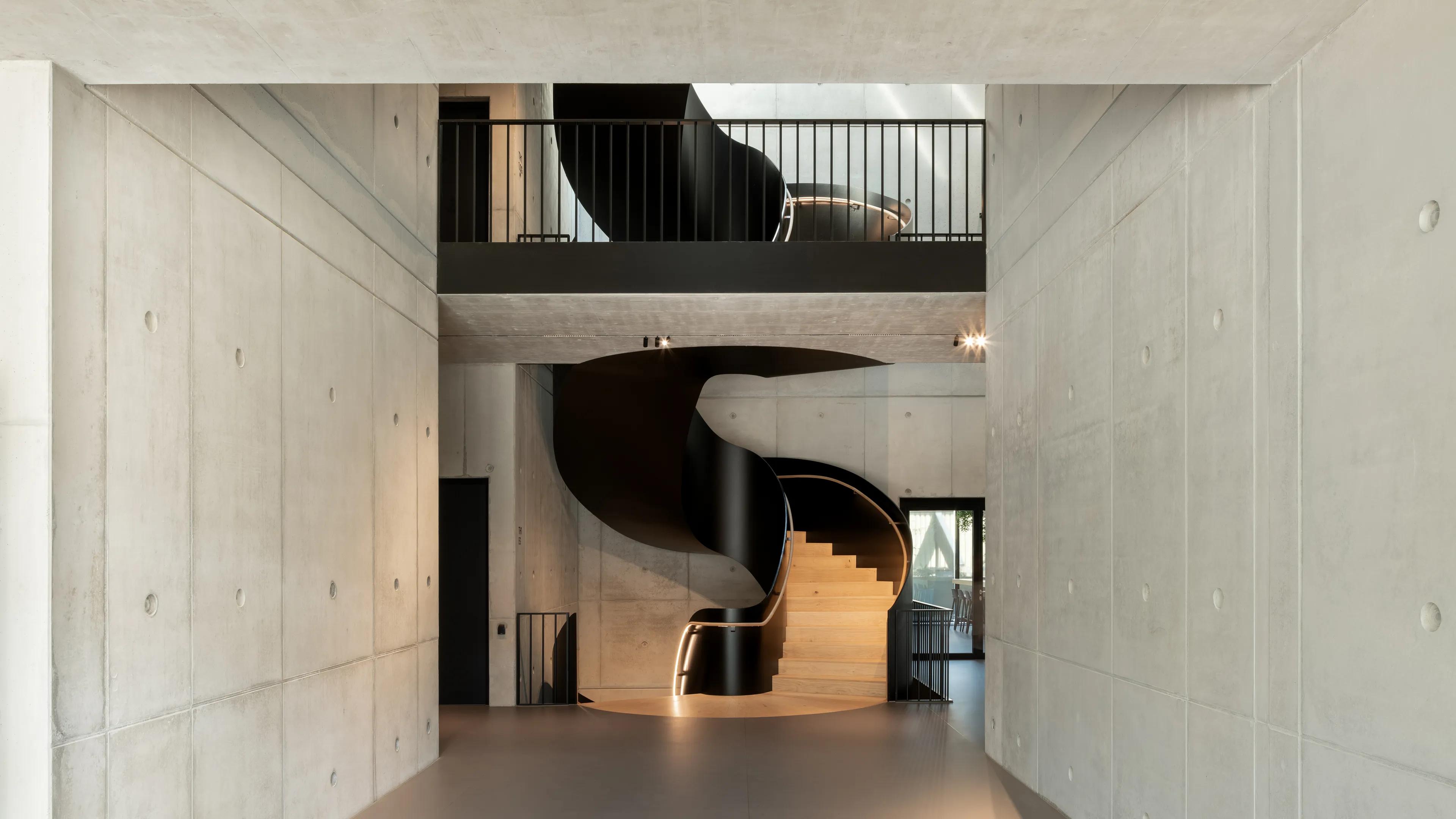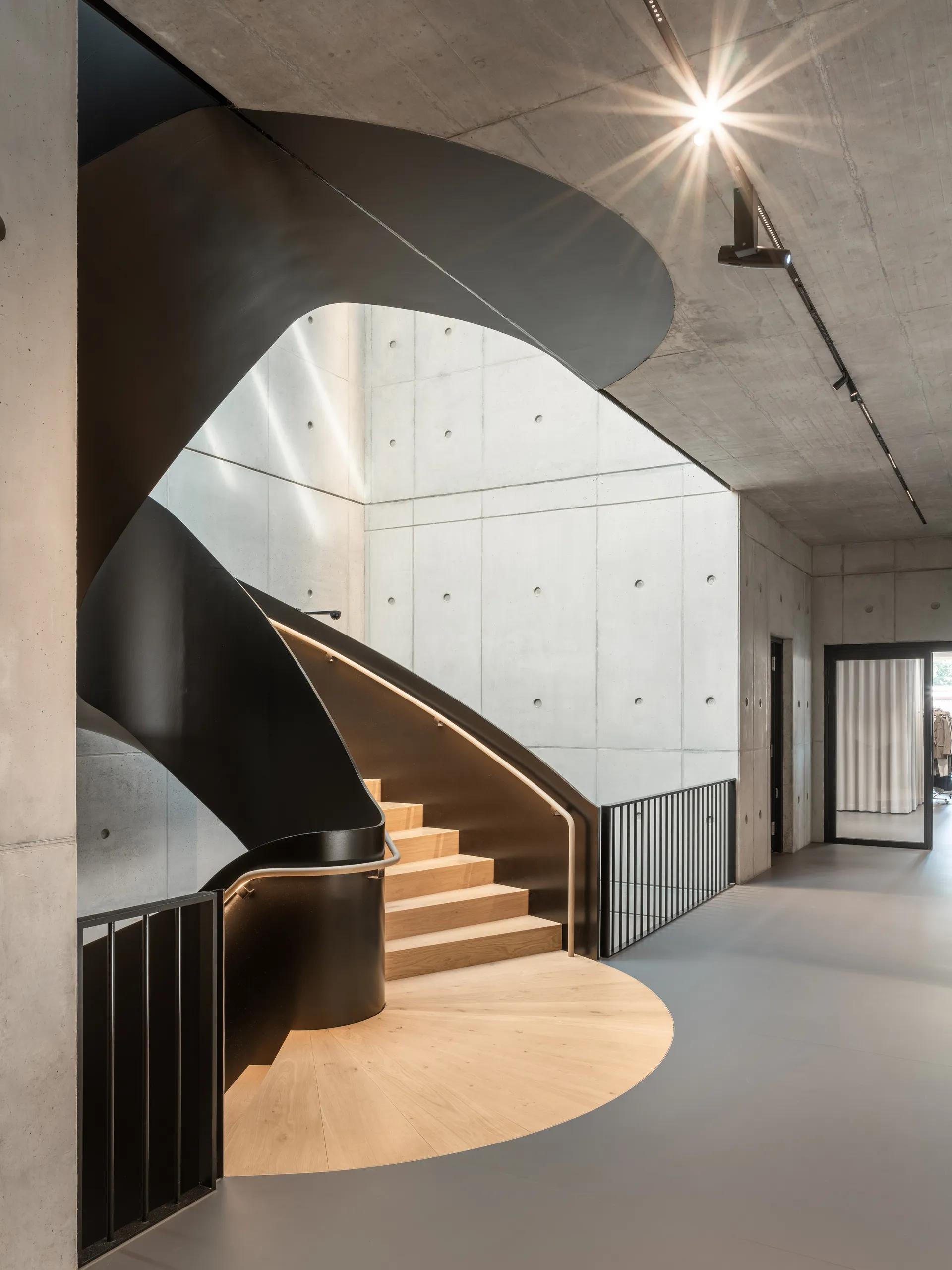 Am Standort nahe des Chiemsees entwickeln rund 150 Mitarbeitende Kollektionen für das internationale Fashion-Label Marc O’Polo. Das Headquarter mit dem House of Product wurde 2023 durch einen modernen Neubau erweitert. Die drei Etagen bieten eine offene, lichtdurchflutete Arbeitsatmosphäre mit flexibler Nutzung und mittendrin: die freitragende Stahltreppe als Designskulptur. Sie erscheint als gedrehtes Band aus Stahl, das scheinbar schwebend durch den Raum führt. Ohne Wandkontakt, mit flankierender Galerie und großzügigem Luftraum auf beiden Obergeschossen gibt die Treppe den Blick frei auf ihre gesamte Höhe. Untersicht und seitliche Wangen der freitragenden Stahltreppe bilden einen dunklen, monolithischen Kontrast zur Umgebung.