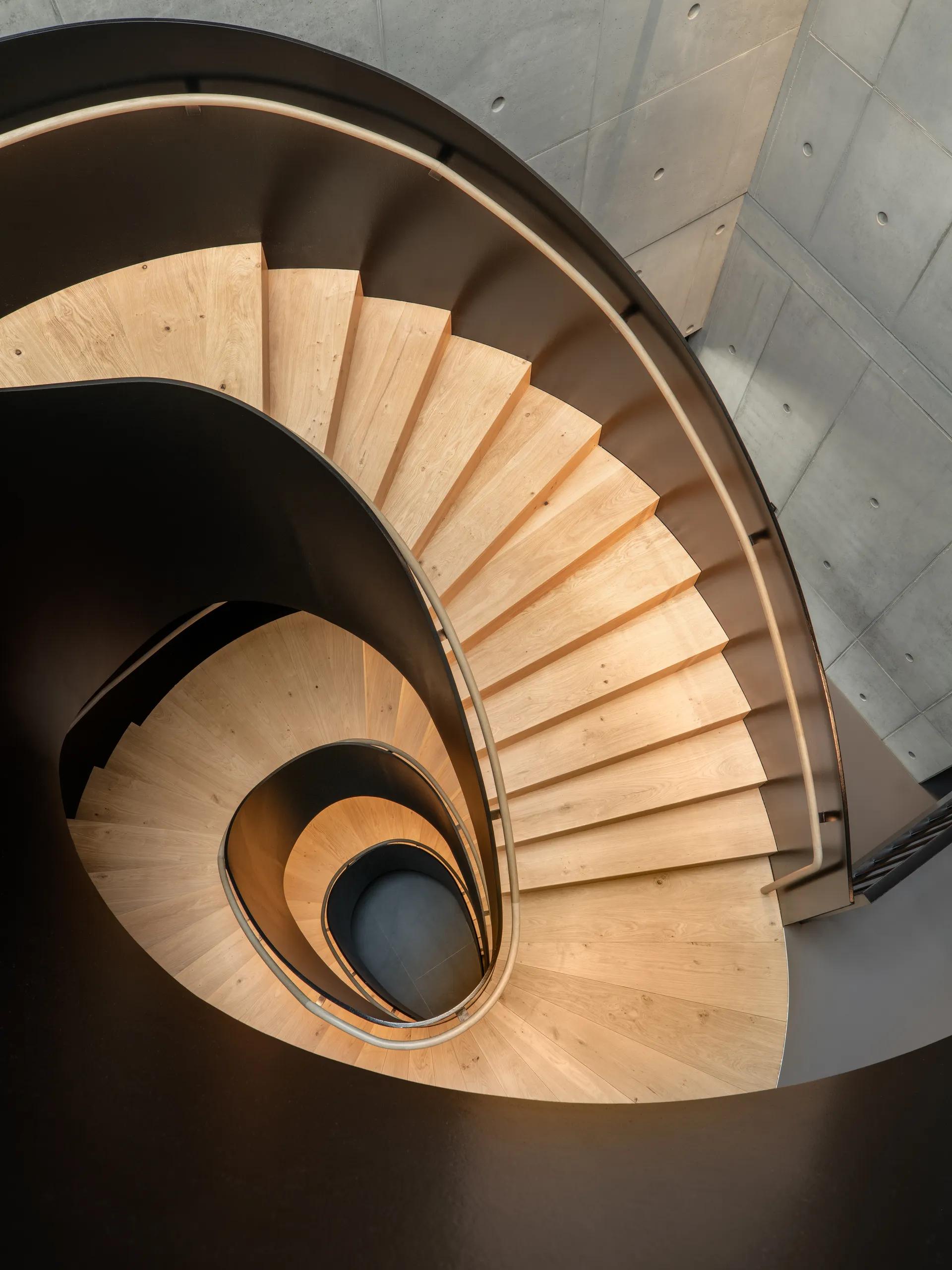 Die freitragende Stahltreppe folgt einer ellipsoiden Geometrie mit drei unterschiedlichen Radien und bis zu vier Radienwechsel pro Lauf. Ihre Untersichtsverkleidung aus bündig eingeschweißten Flachstahlblechen trägt statisch mit und optimiert das Schwingungsverhalten.