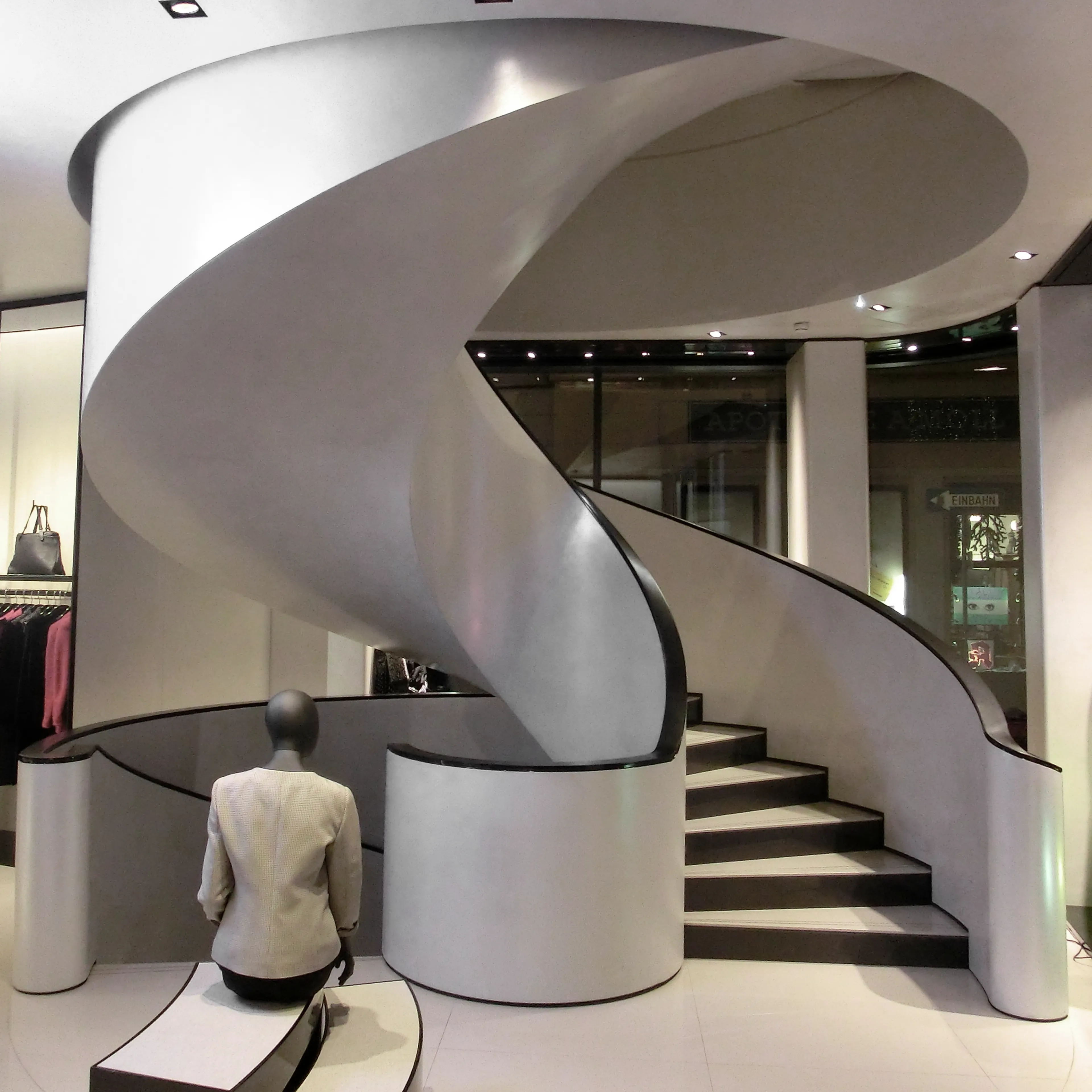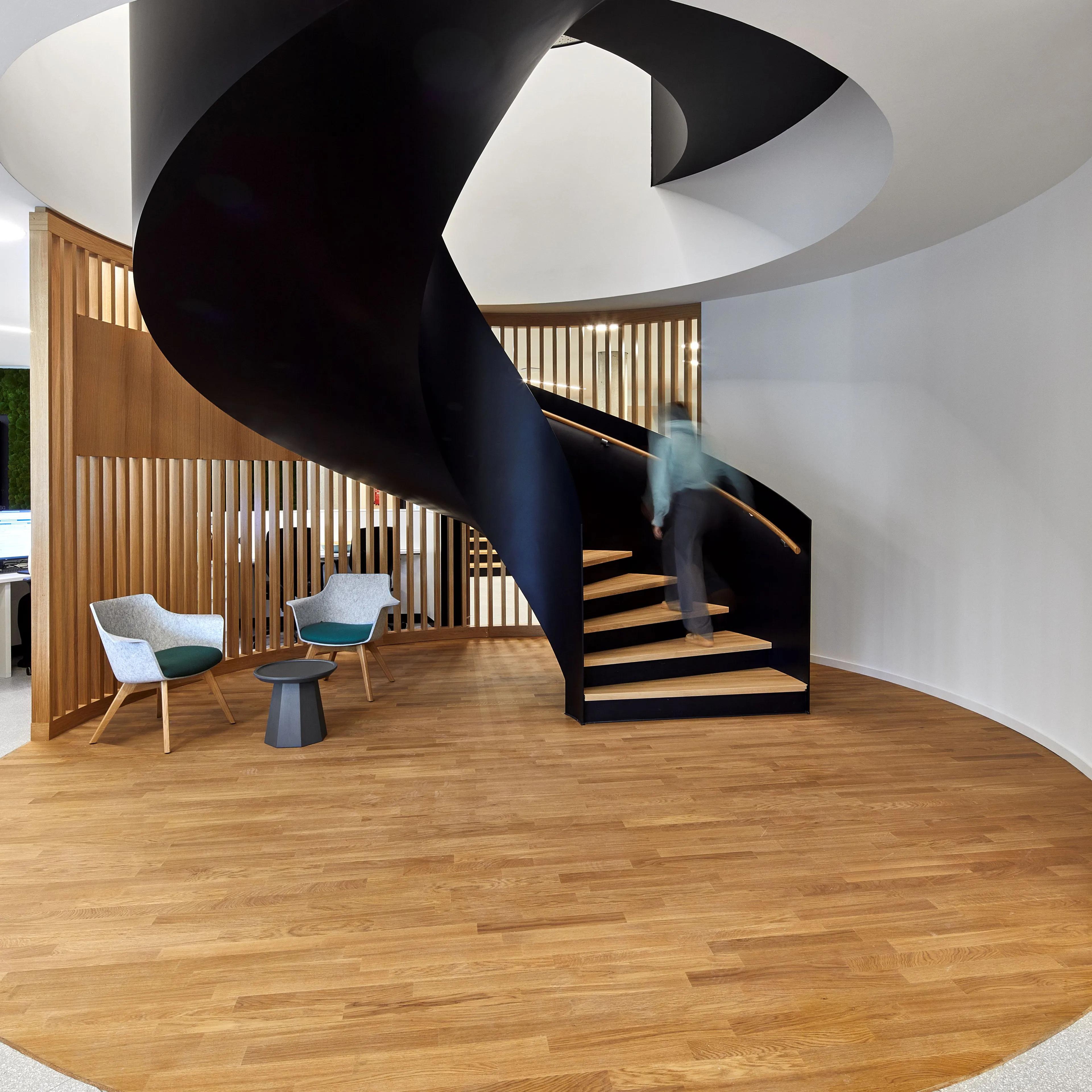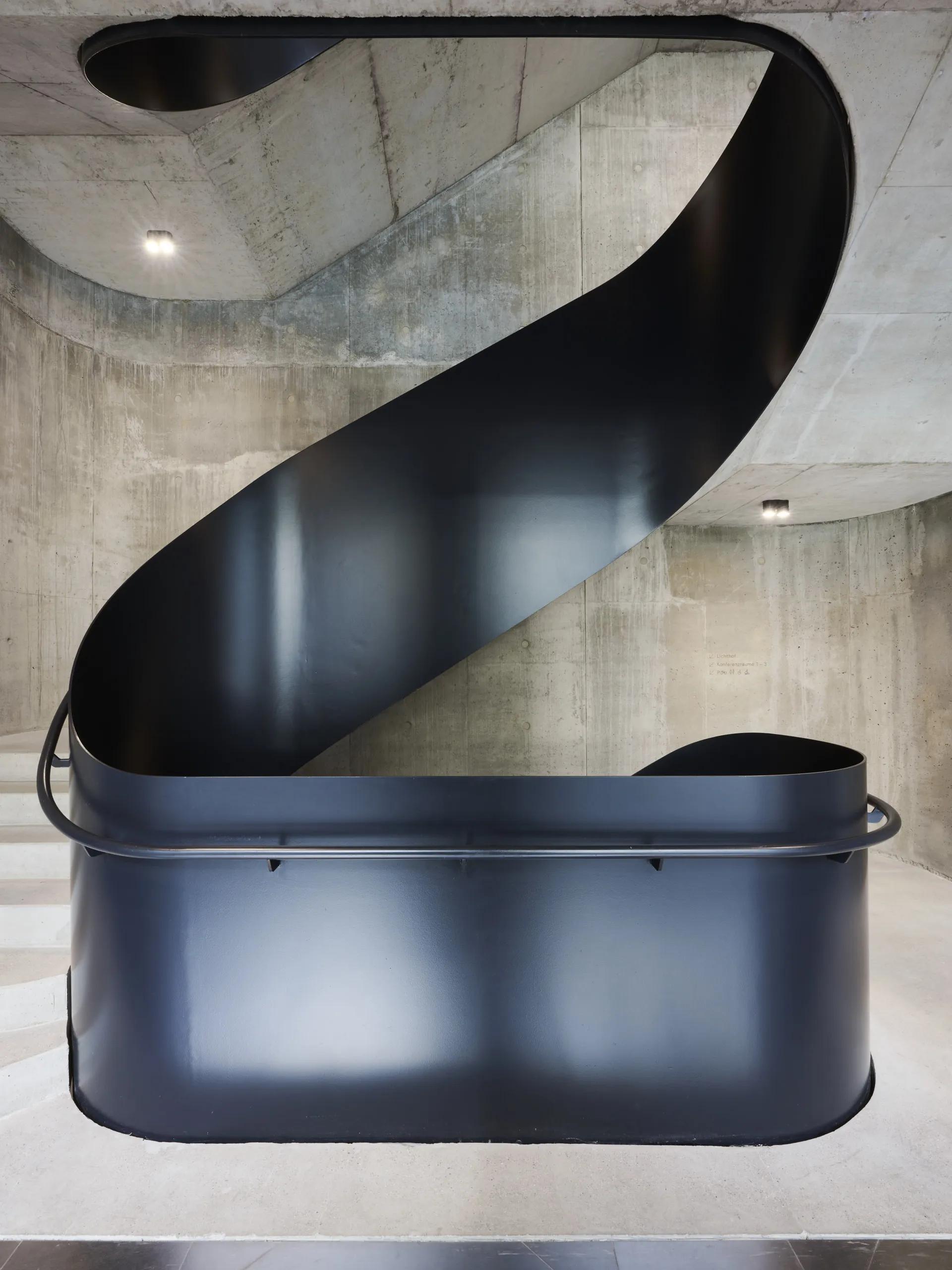 METALLART kreierte für die mehrläufige Anlage kontrastierende Flachstahlelemente in graphitschwarzem Finish. Als elliptisch gebogene Stahlbrüstung entlang der Treppe und ergänzend als Stahlbrüstung an den Deckenrändern bilden die Bauteile eine charakterstarke Symbiose zwischen Form und Material. Der ebenfalls aus Stahl bestehende Handlauf entlang der horizontal bzw. steigend horizontal gefertigten Stahlbrüstungen hat gleichermaßen funktionale als auch gestalterischen Effekte und vervollständigt das markante Design der Flachstahlelemente.
