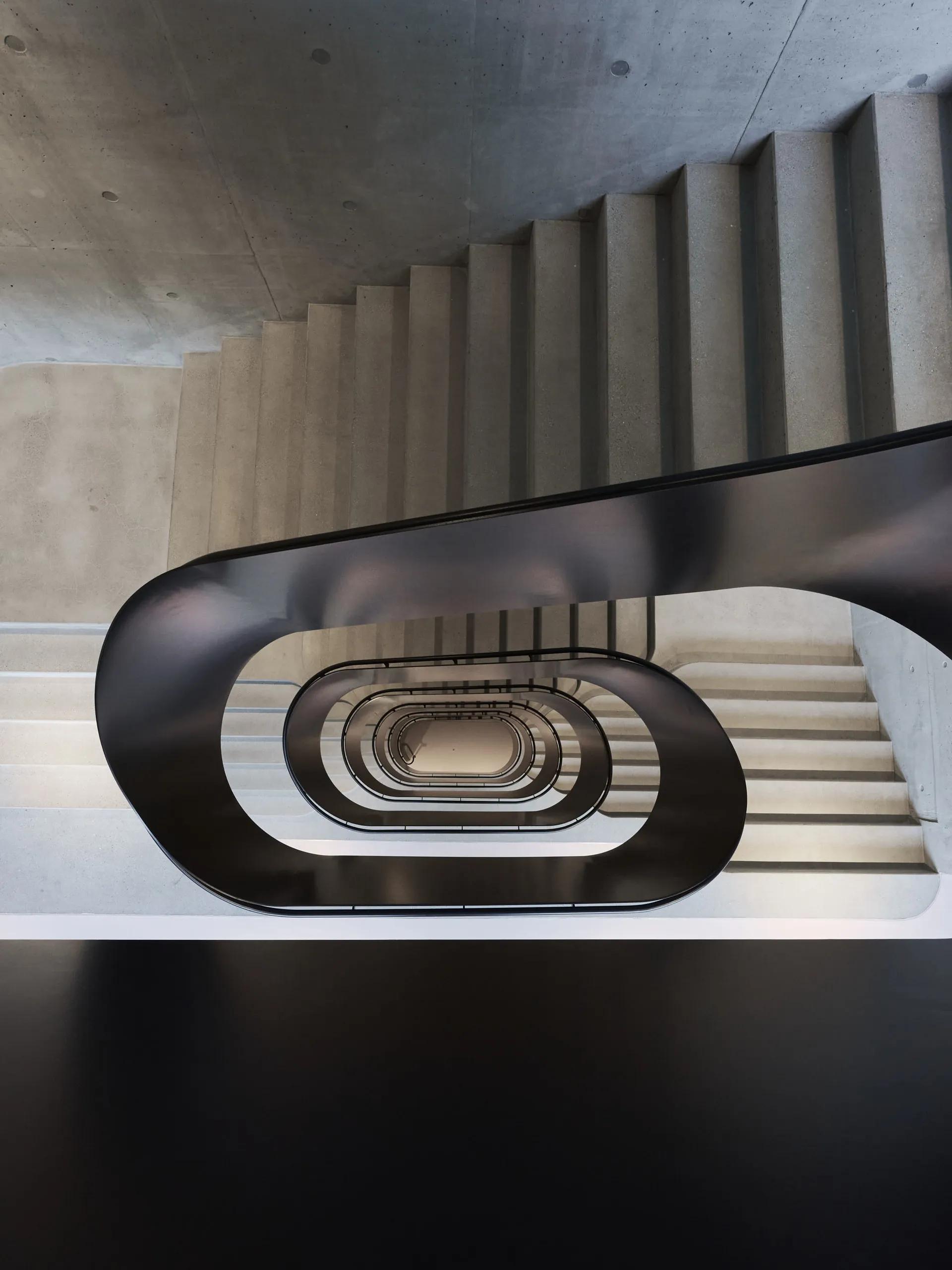Auf fünf Etagen verbinden sich Zukunft und Historie auf flexibel kombinierbaren Flächen und getragen von innovativer Architektur. Der Werkstoff Beton dominiert im gestalterischen Konzept und bildet auch die Basis der ovalen Treppenkonstruktion, die zwischen Neubau und mittlerem Querbau verläuft.