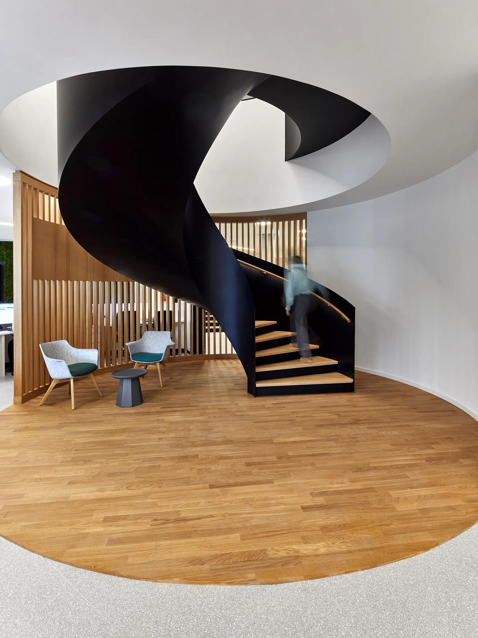 Die skulpturale, gleichmäßig gerundete Wangentreppe von METALLART ist eines der Highlights im einladenden neuen Head Office von Deutschlands größtem reinstem Ökostromanbieter LichtBlick. Die Planung bis hin zur Möblierung der neuen Büroräume am Klostertor 1 in Hamburg hat die apoprojekt GmbH hier in einem ganzheitlichen Konzept umgesetzt.