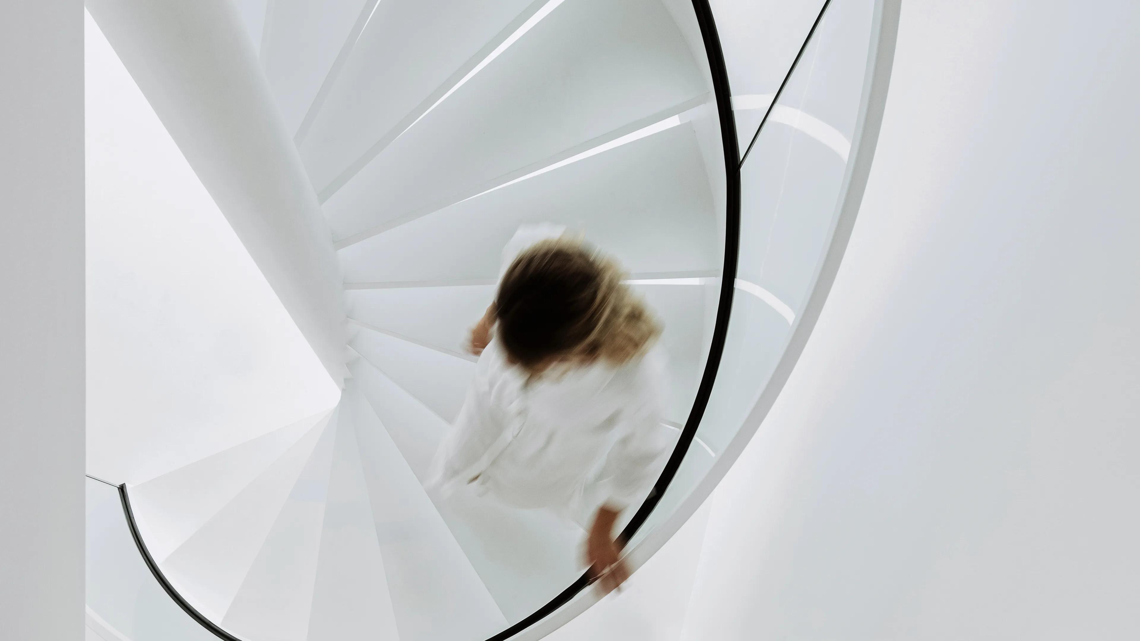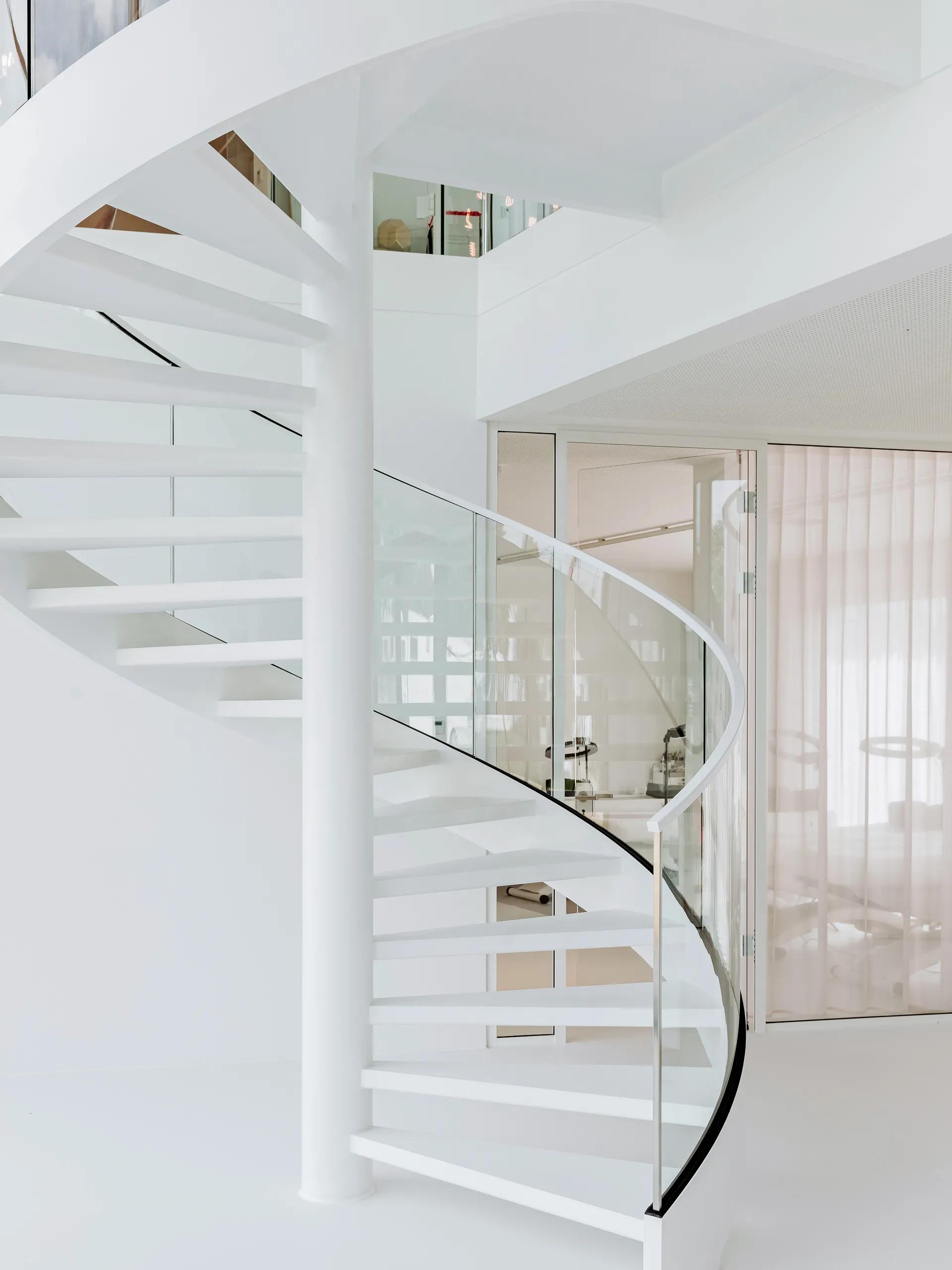 Die Glaswange der Treppe zeichnet sich durch großflächige gebogene Glasscheiben aus, welche nur von der Wange gehalten werden. Inspiriert von der Form eines Wimpernkranzes, umschließen die weißen Trogstufen der eleganten Spindeltreppe im Eingangsbereich sanft die Mittelsäule.
