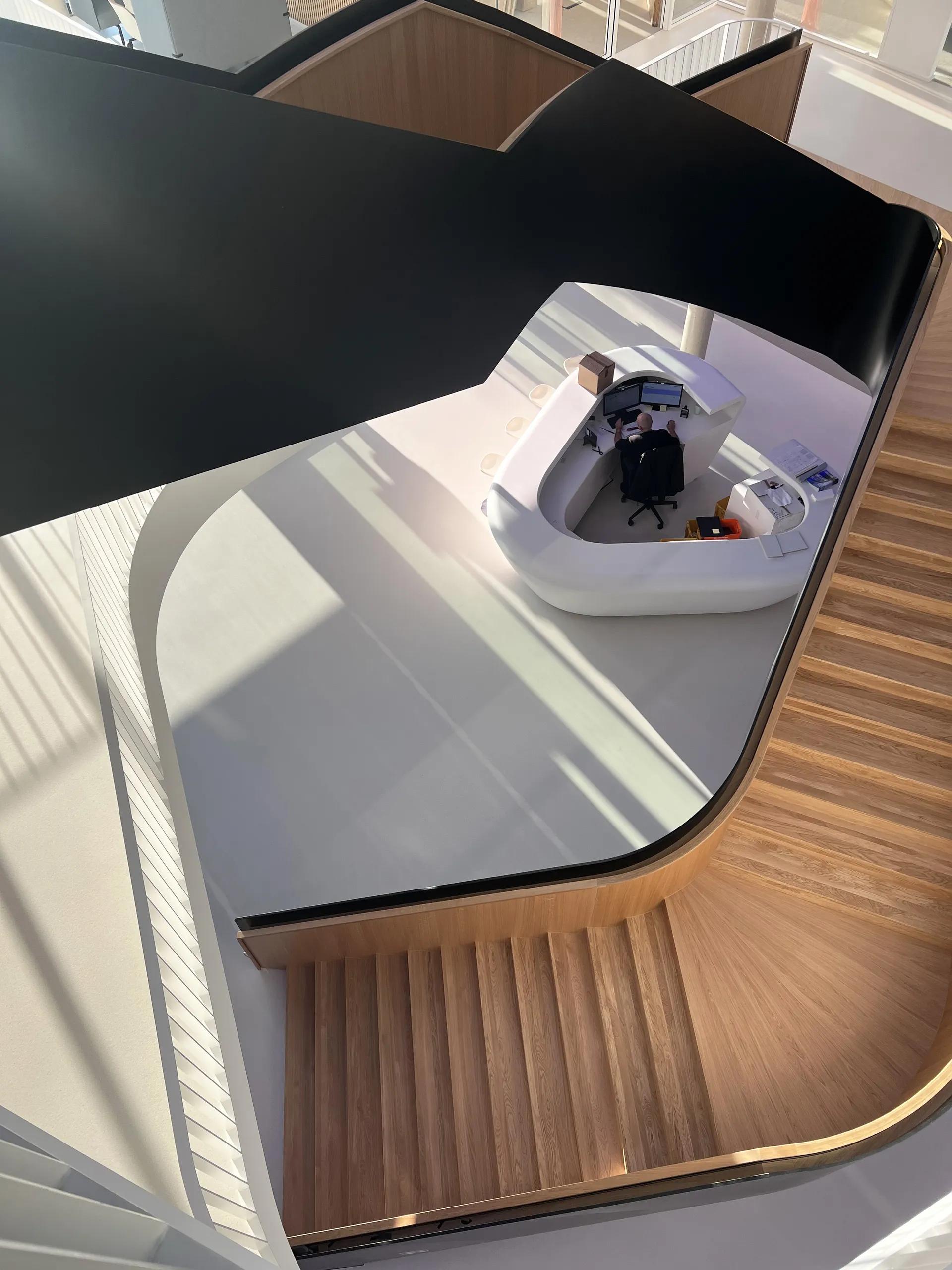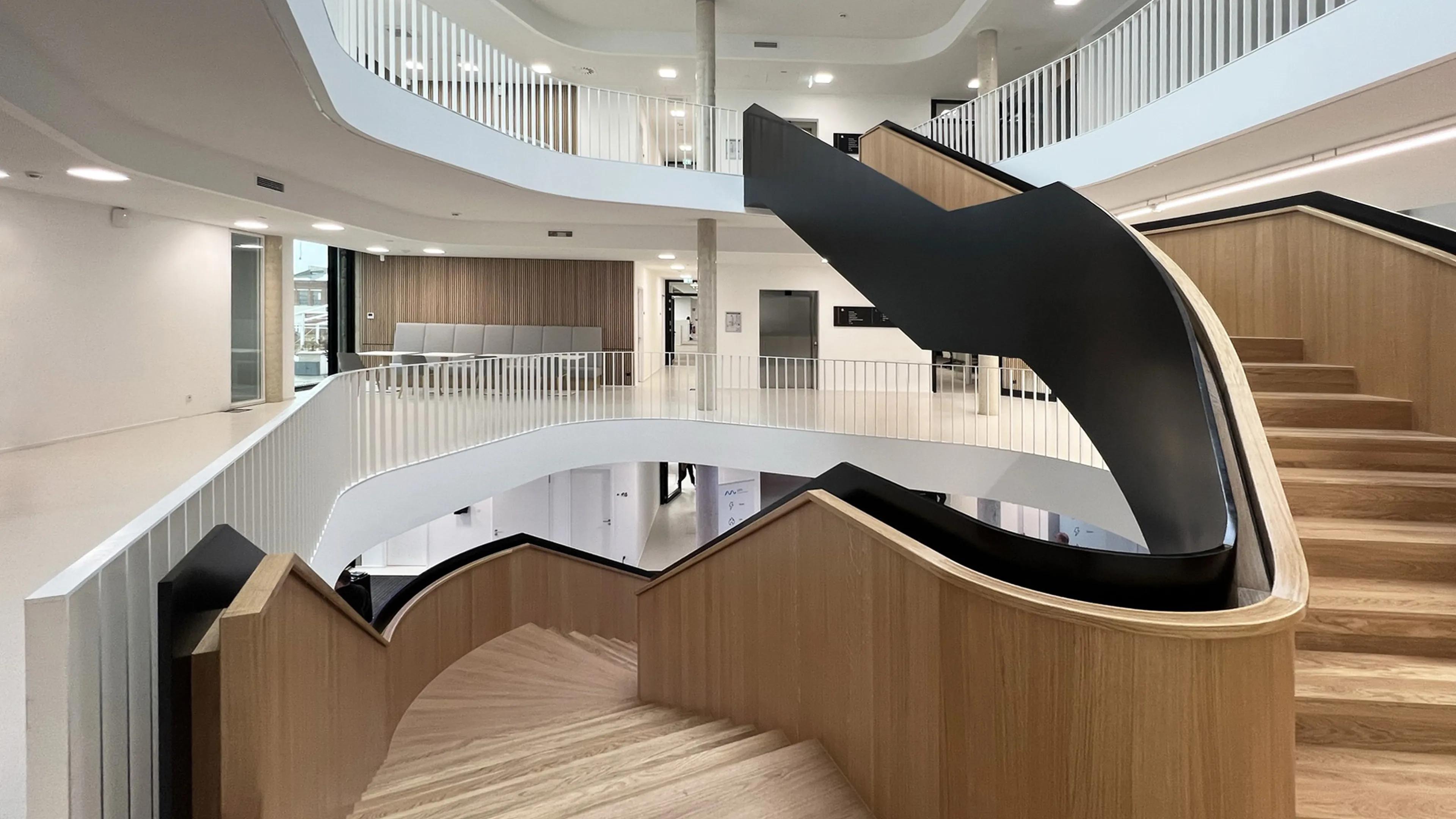 Entsprechend der Arbeitsweise des Unternehmens wurde die Treppenanlage als eine Art Marktplatz konzipiert, der gleichermaßen Kommunikationsbereich und Verbindungselement ist und den Eingangsbereich mit den beiden oberen Geschossen verbindet. Ihre organisch geschwungene Form und der kontrastreiche Materialeinsatz geben der selbsttragenden Treppenanlage eine kraftvolle Wirkung. Gemeinsam mit unserem Partnerunternehmen Holz in Form Niedermeier entstand eine ästhetische Symbiose aus Stahl und Holz, die nicht nur funktional überzeugt, sondern mit ihrem einladenden Charakter ein außergewöhnliches Ambiente mit Wohlfühlatmosphäre schafft.