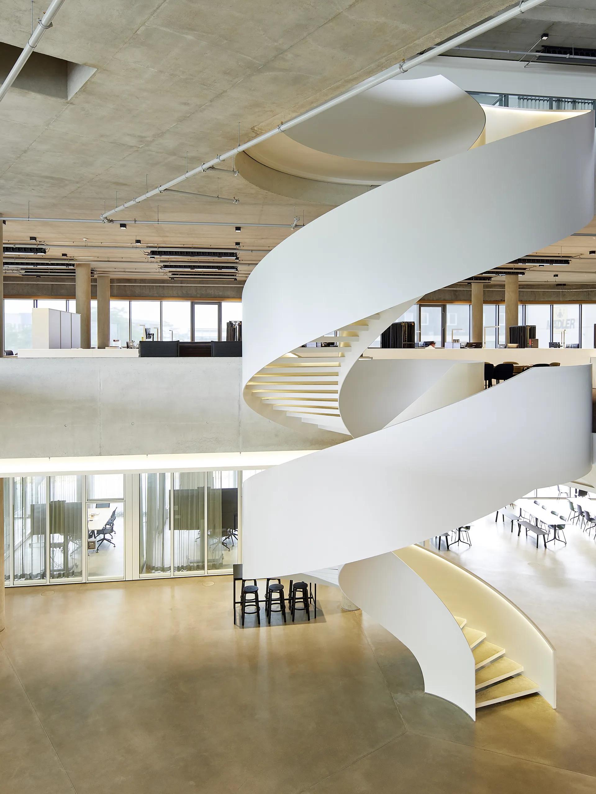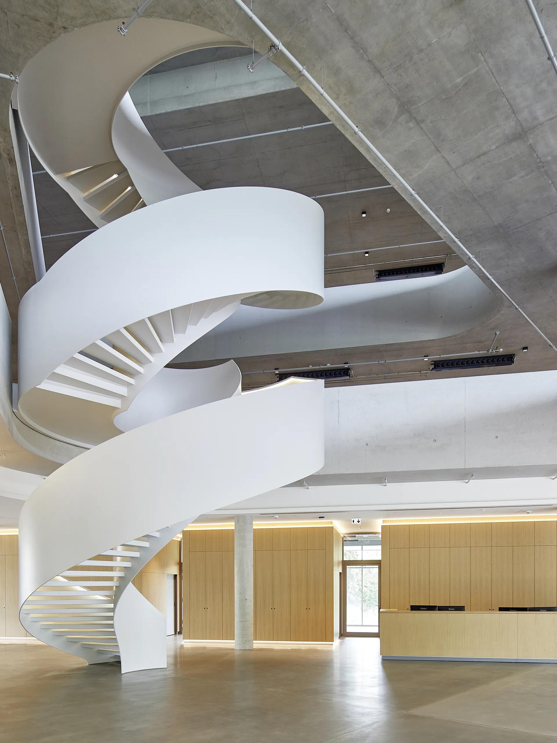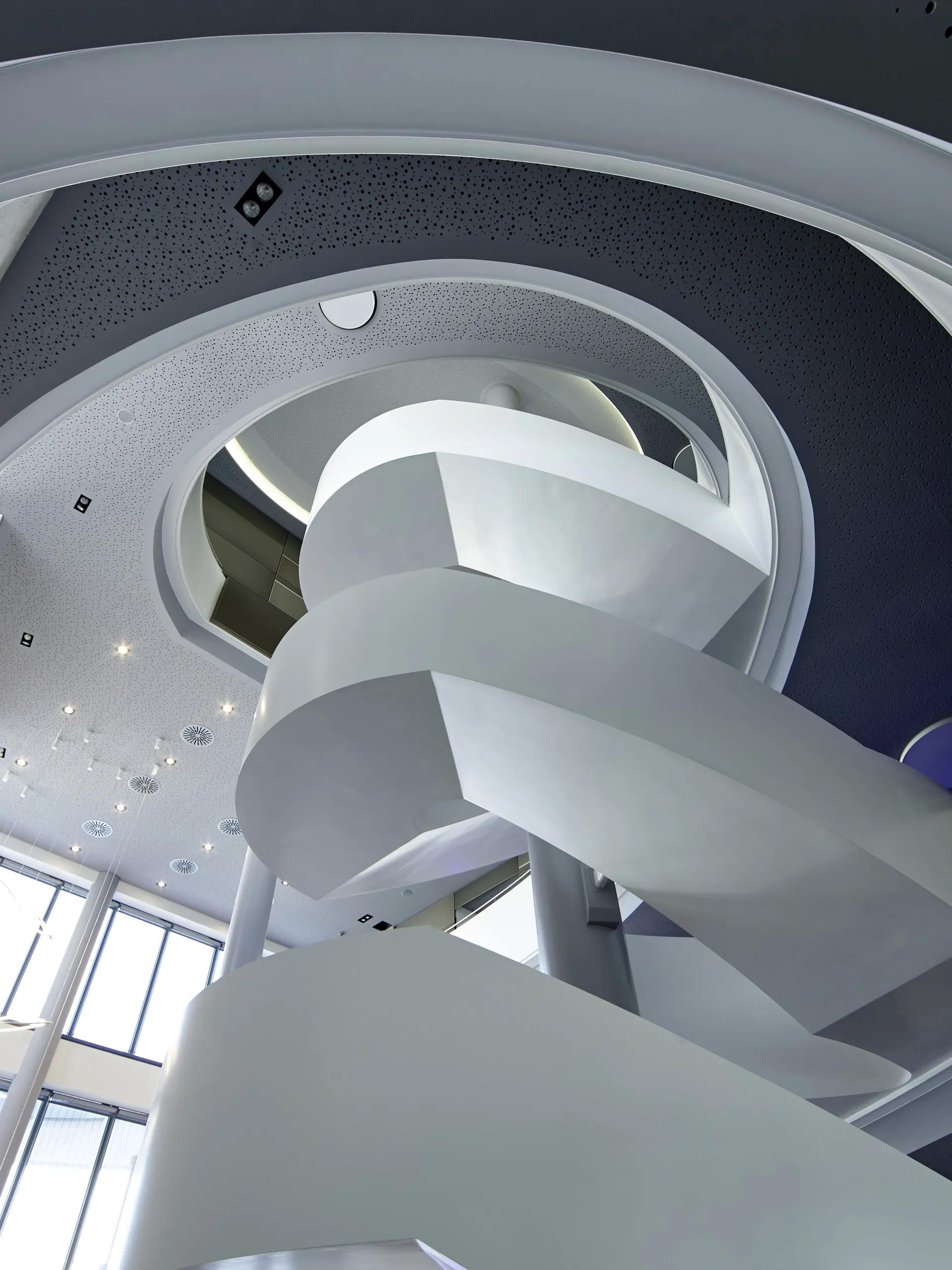 - Spiral stairs as foyer stairs for commercial buildings and banks: with generous storey heights and a spacious diameter for a comfortable flight width