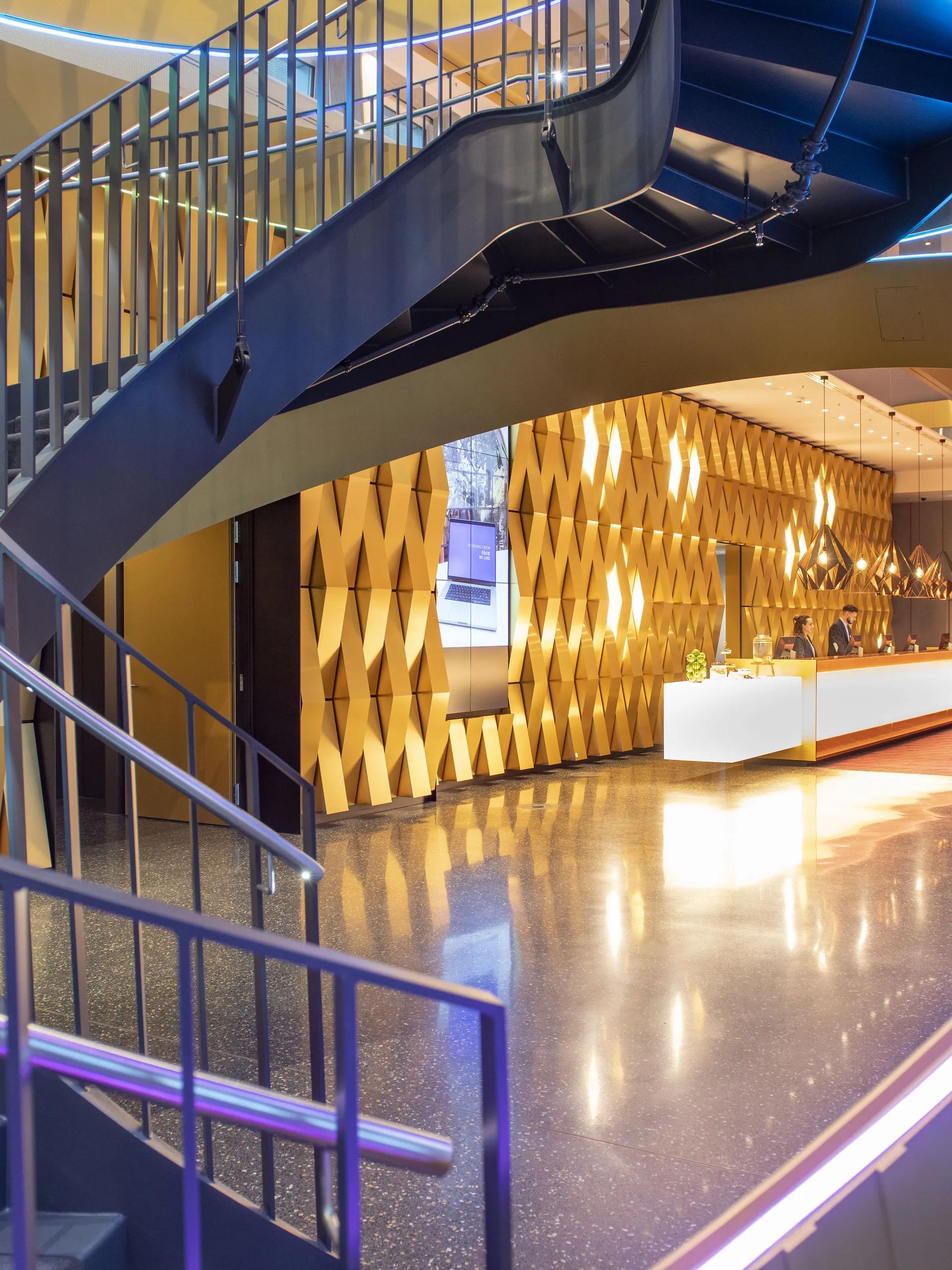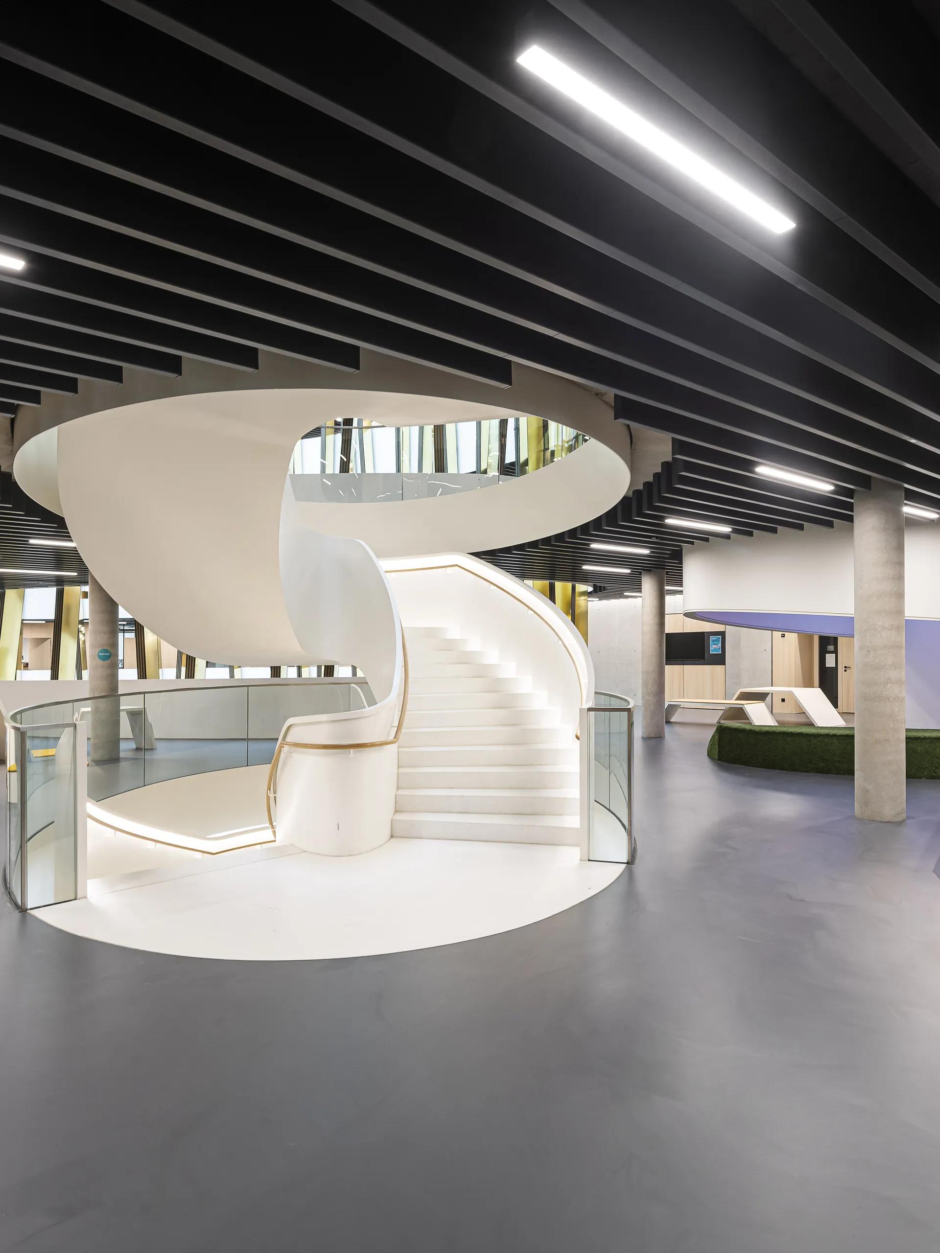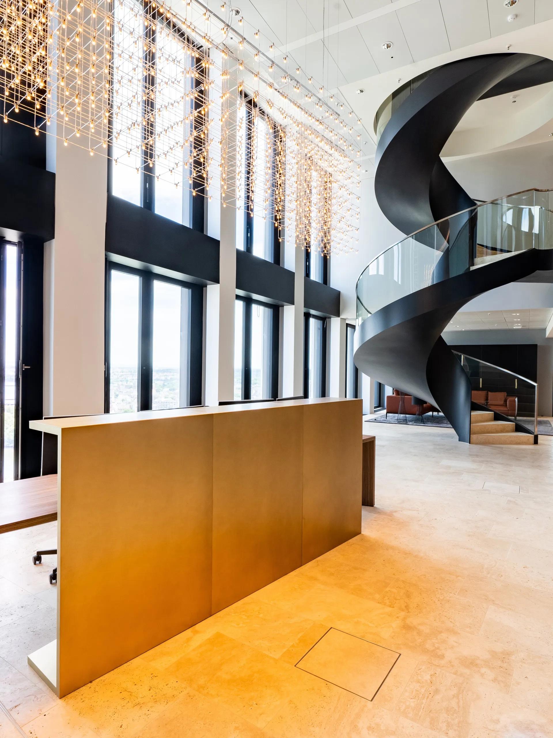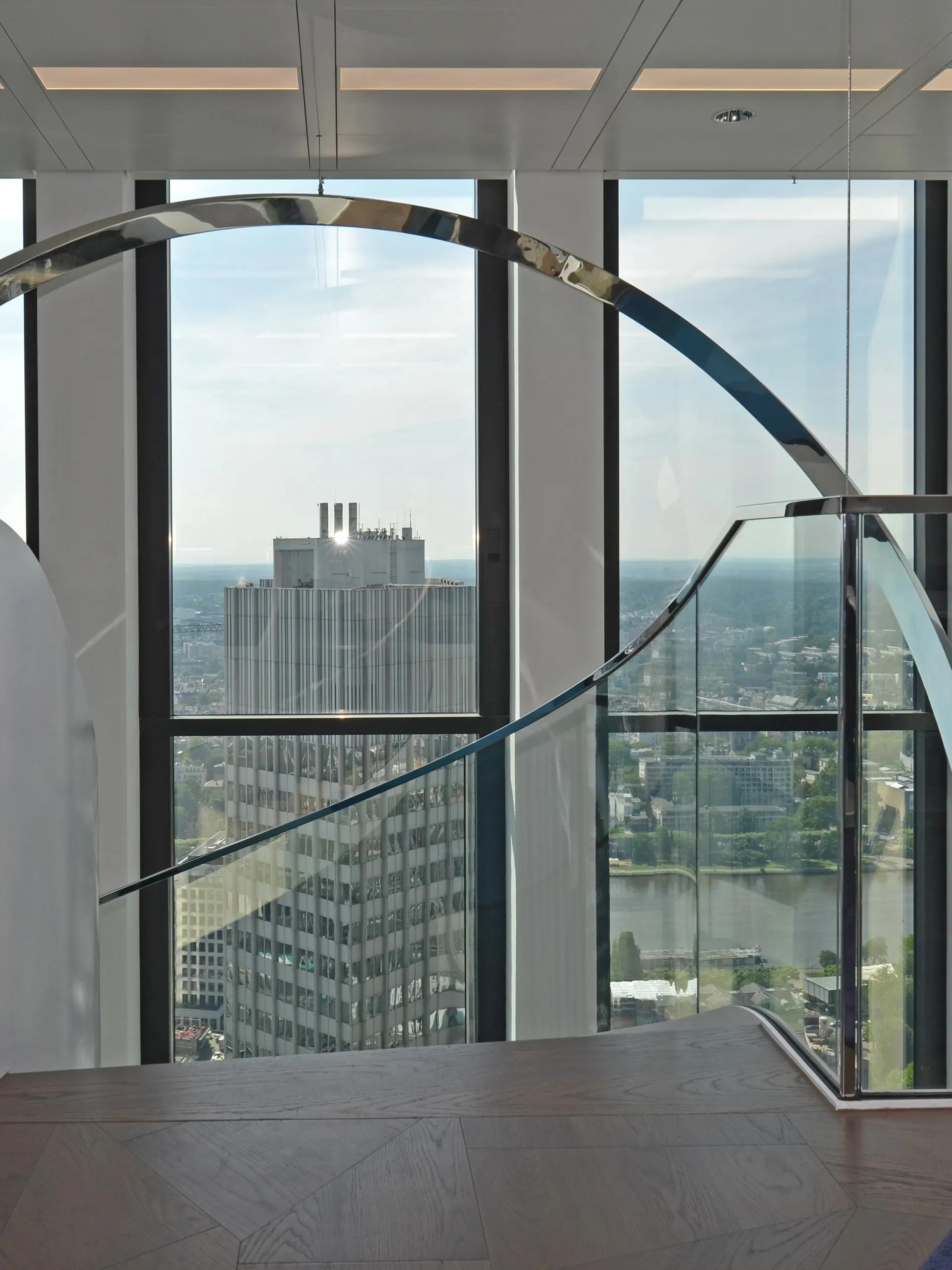 - Spiral stairs as foyer stairs for commercial buildings and banks: with generous storey heights and a spacious diameter for a comfortable flight width