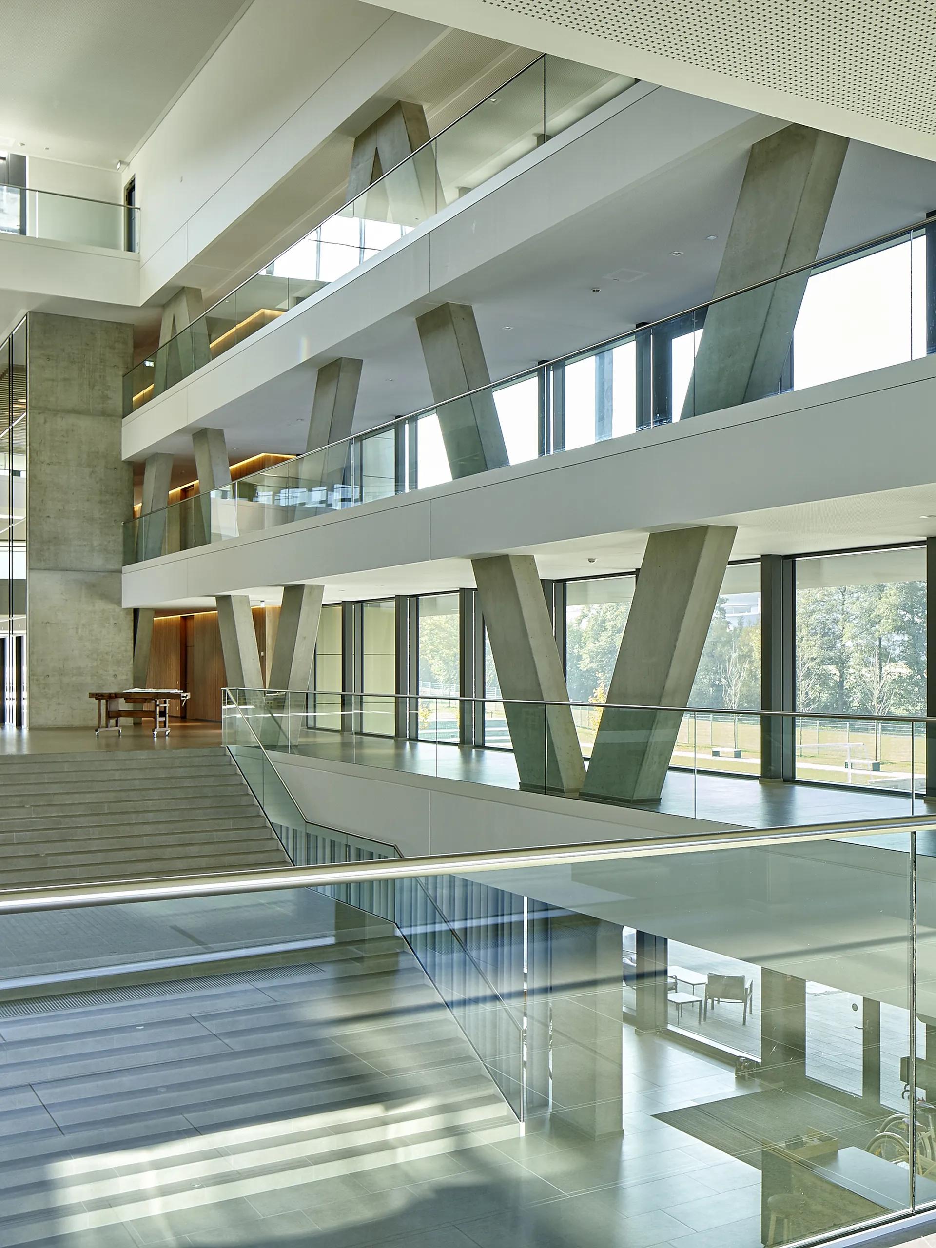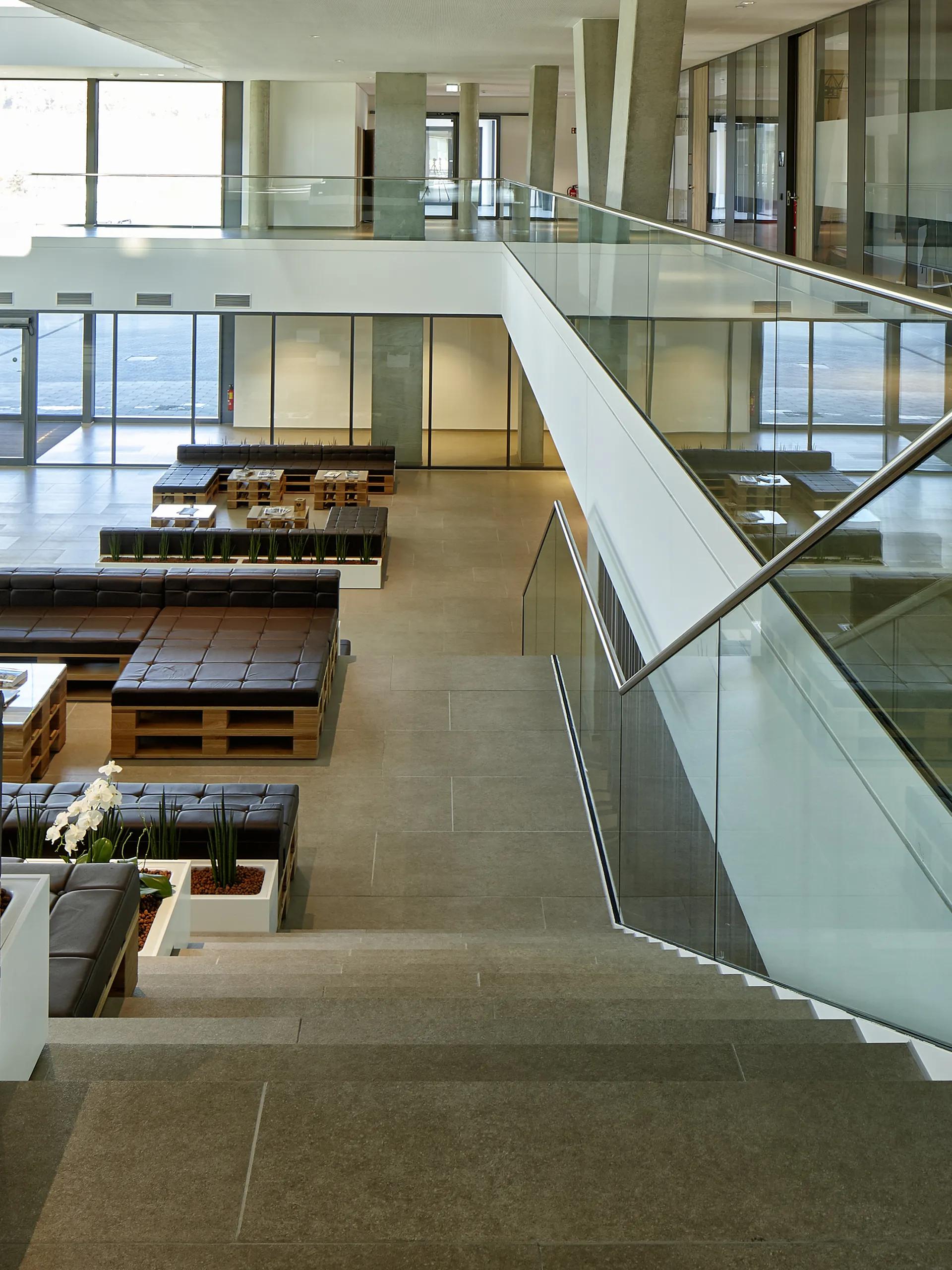 The transparent glass railings with their horizontal stainless steel handrail emphasize the linear architecture of the building with its symmetrically arranged galleries and walkways.