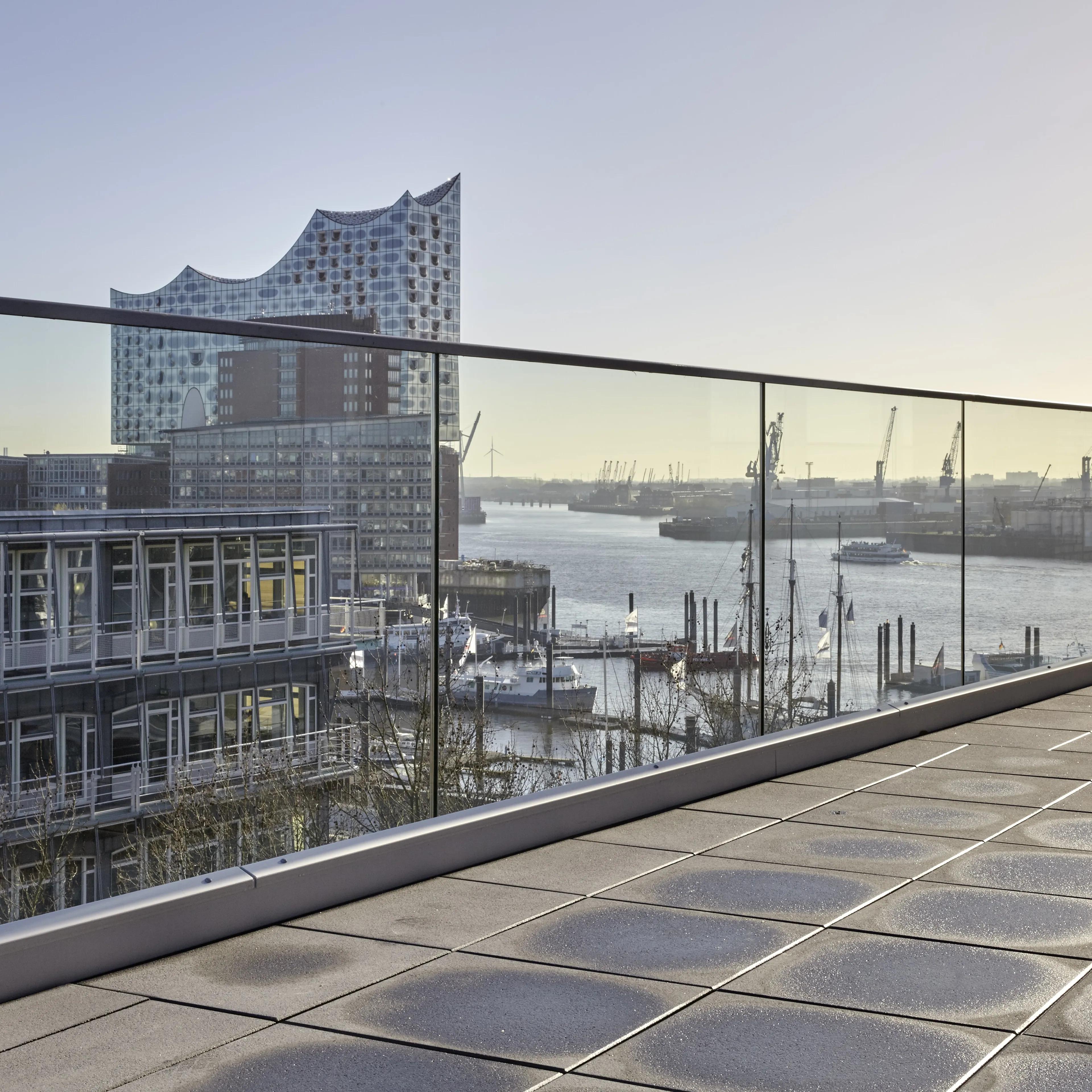 - stainless steel round tube handrail with groove, diameter 48 mm, glued and sealed to the glass panels with neoprene interlayer