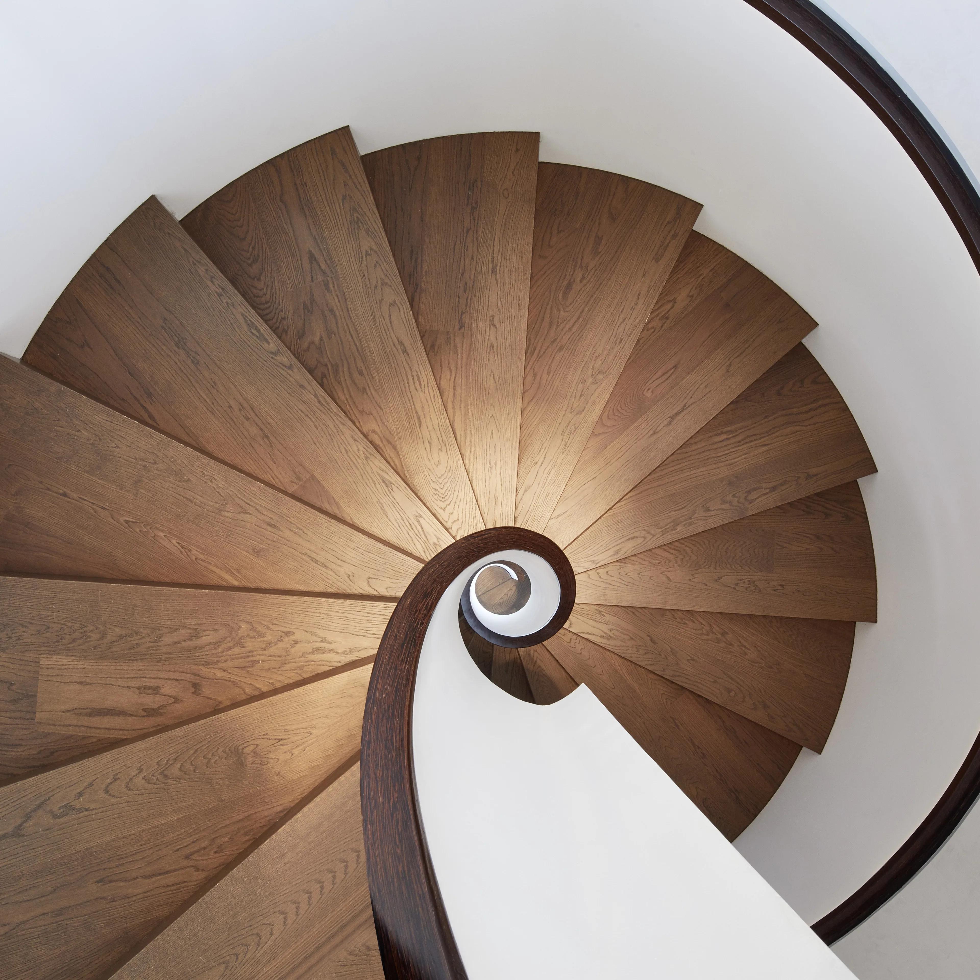 Visually inspired by the box stringers of the designer staircase, a railing with a box balustrade joins the gallery. It acts as a lining for the circular ceiling edge and gives the steel construction a homogeneous character.