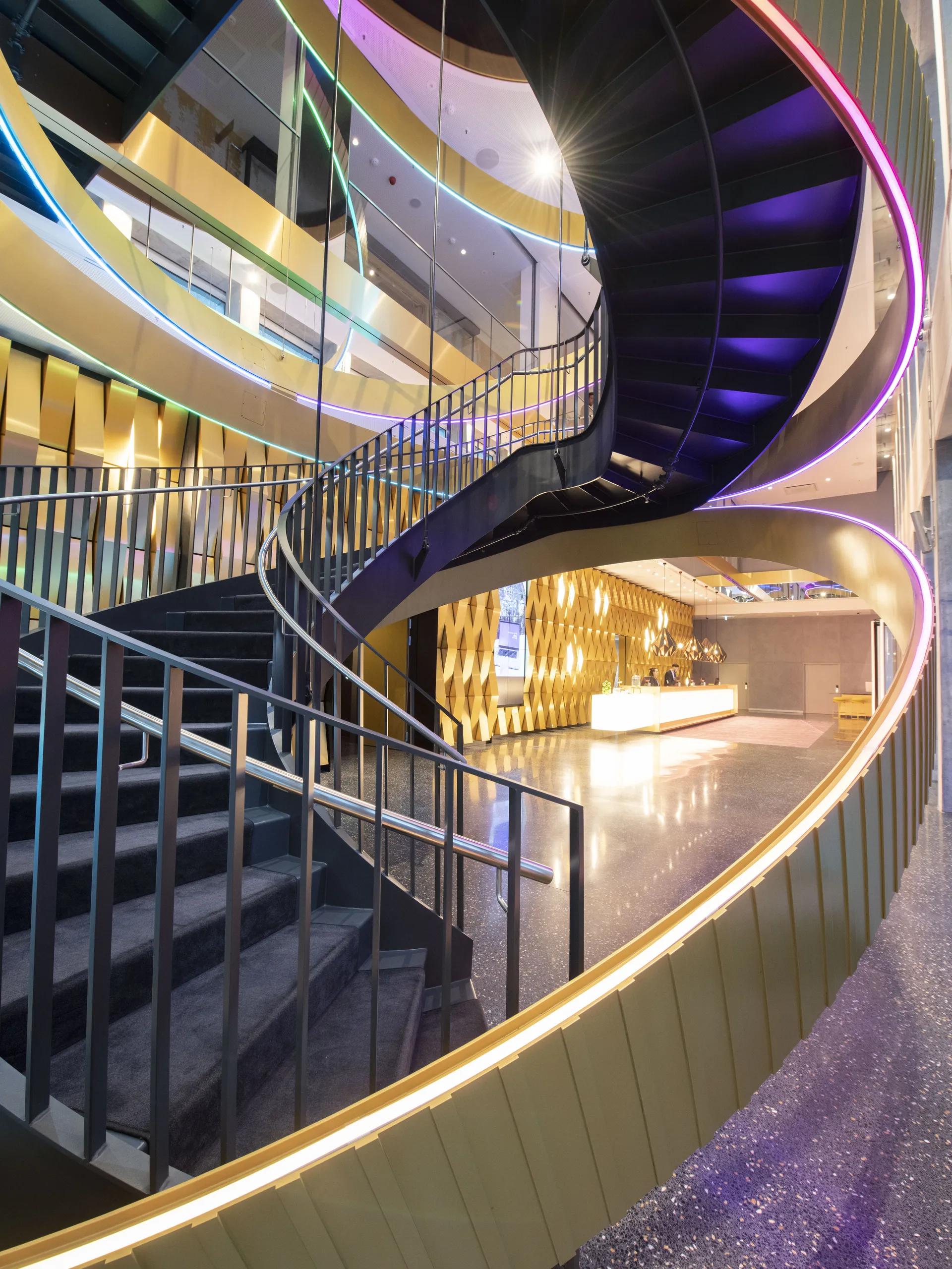 The 4-star superior hotel nhow has 375 rooms, restaurants, conference areas and a sky bar, spread over 14 floors. The ascent from the hotel lobby to the restaurant on the second floor is via an impressive ellipsoidal design staircase. The Spanish design studio Rafael de la Roz based the design of the golden sculpture on the design concept "The Art of Money". The overlapping golden rings surrounding the design staircase are inspired by the unpredictable falling of coins and convey a sense of movement and lightness. The aesthetic paling balustrade of the designer staircase is completed by a handrail made of stainless steel round tube with LED lighting, which provides harmonious and safety-relevant illumination.