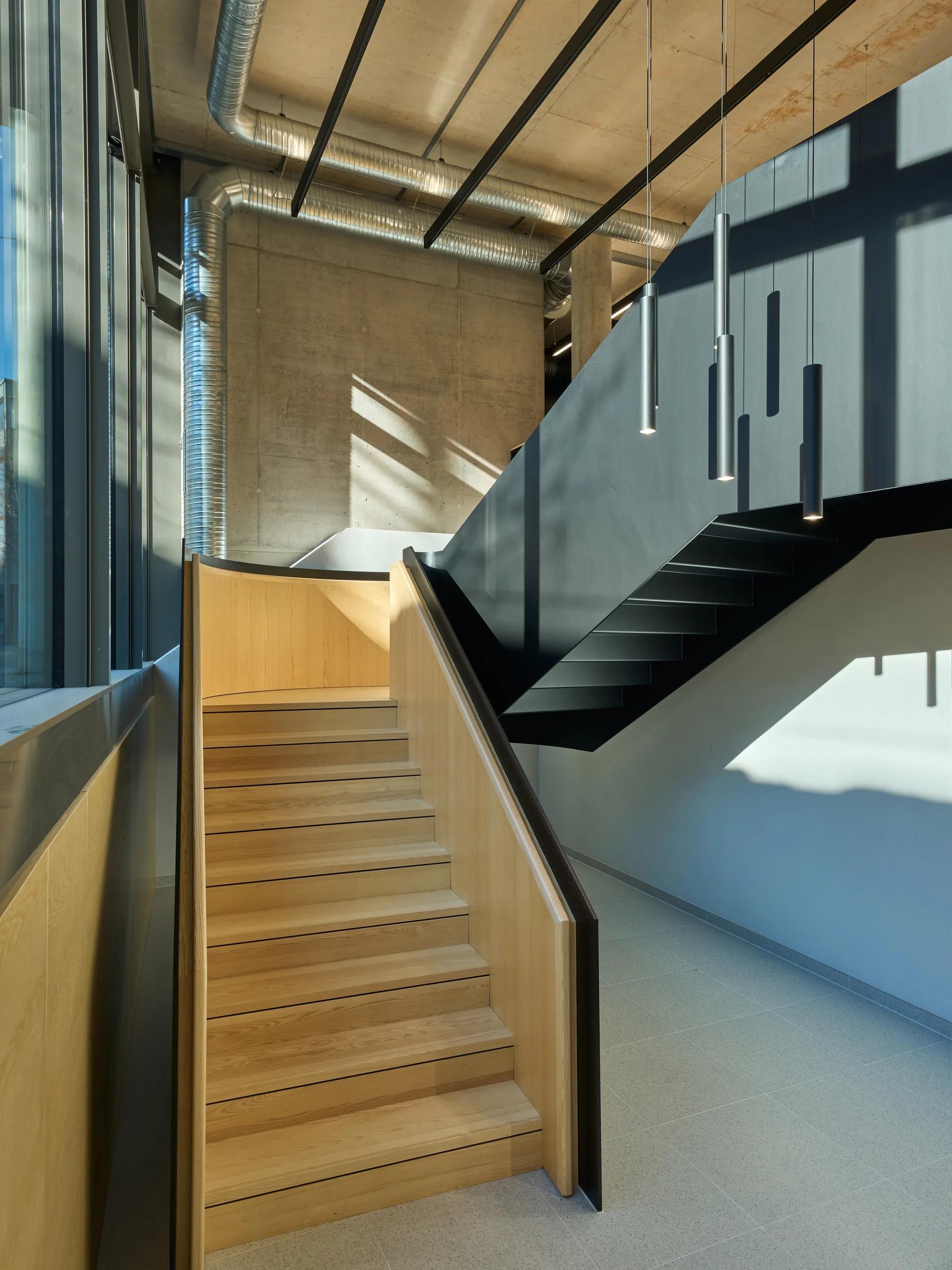 With its dominant character, the cantilevered flat steel stringer staircase connects the basement with the first floor of the conference and congress center, where trade fairs can be aligned alongside workshops, meetings and conferences. The interior design contrasts raw concrete and plain surfaces with black steel, wood and colorful accents. As a sculptural installation, the flat steel stringer staircase with rounded intermediate landing meets the existing spatial situation of the 20-year-old original administration building and sets strong accents with its design and materials. On the first floor, a ceiling parapet was designed to match the black flat steel stringers as a lining for the pulpit, which is part of the DenkDeck designed as a co-working space.