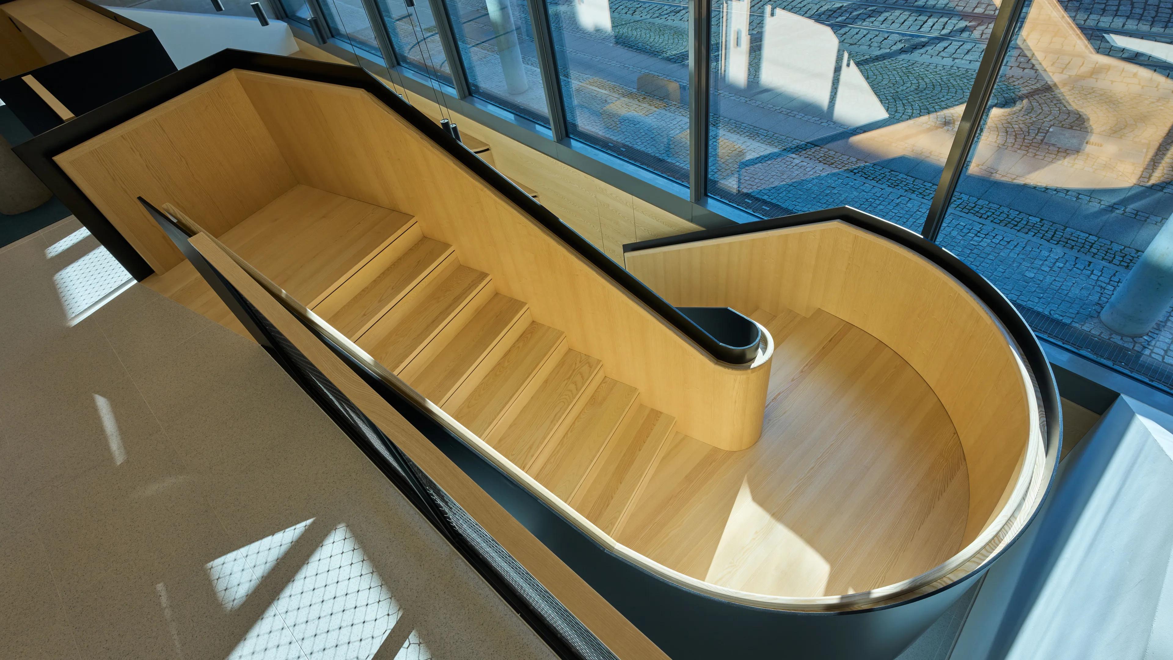In the newly opened COMCENTER in Erfurt, the double-flight flat steel stringer staircase impresses as a custom-made design object.