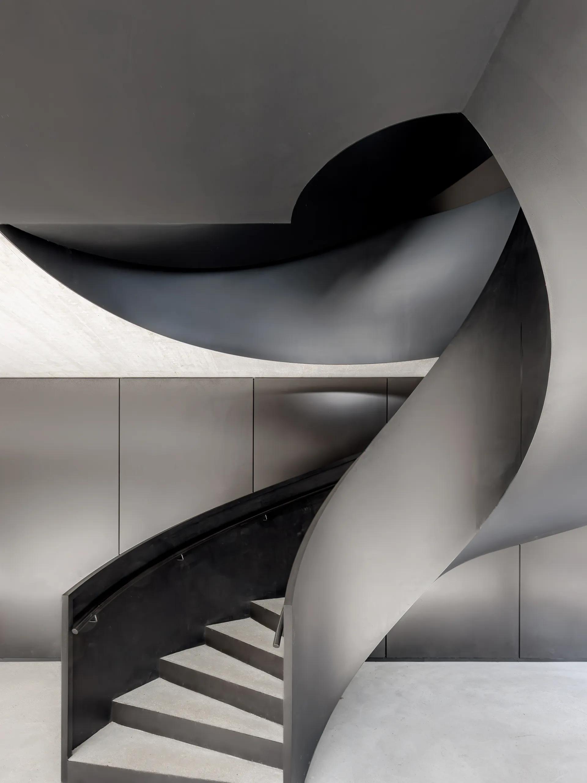 - Spiral steel stringer stairs, 2 flights, symmetrically rounded floor plan