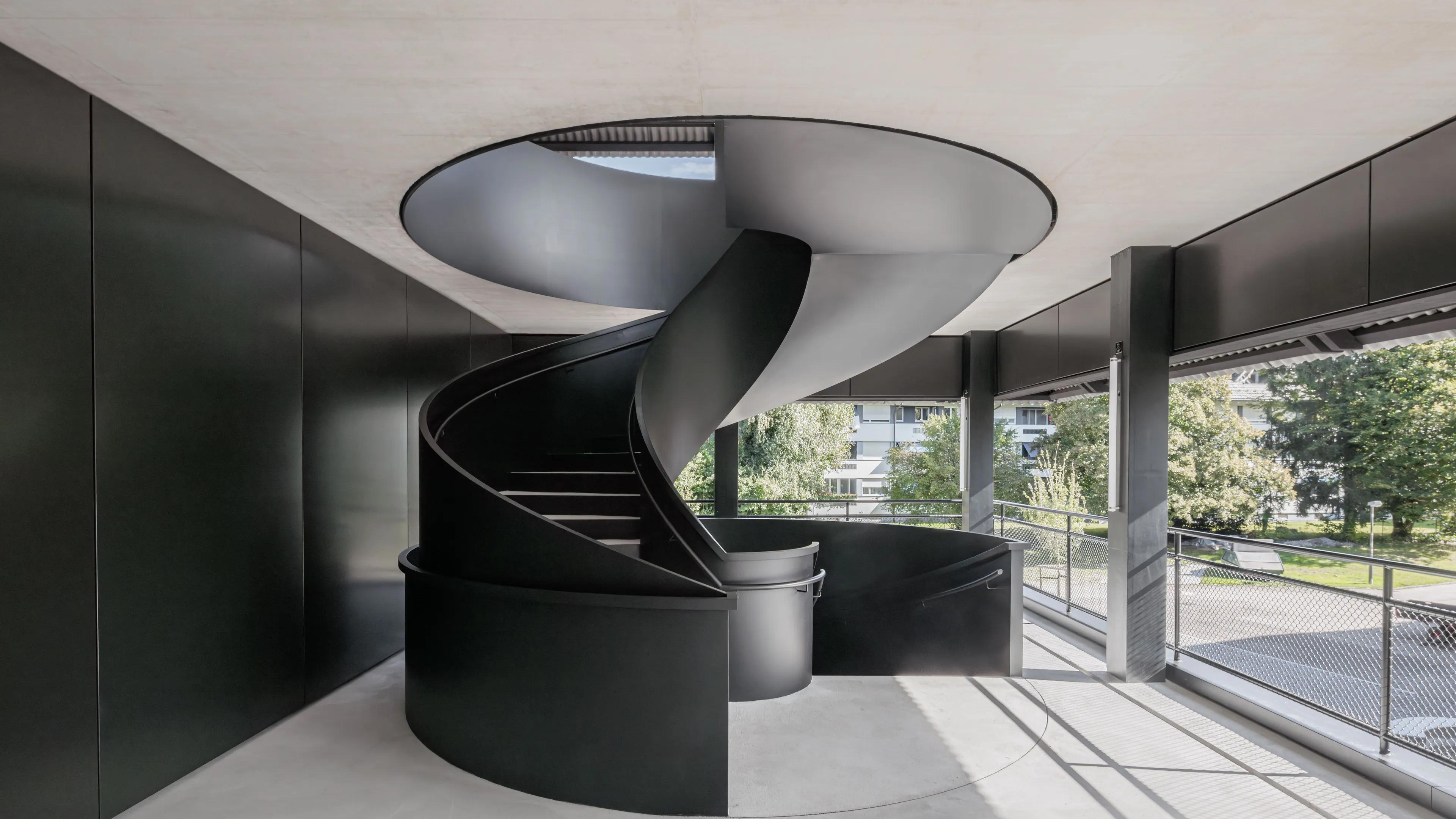 The sculptural outdoor stairs at the Steinwies school building in Schwerzenbach is an architectural masterpiece made of steel. With its striking spiral shape and dimensionally stable soffit cladding, it is the highlight of the new building - both functionally and aesthetically.
