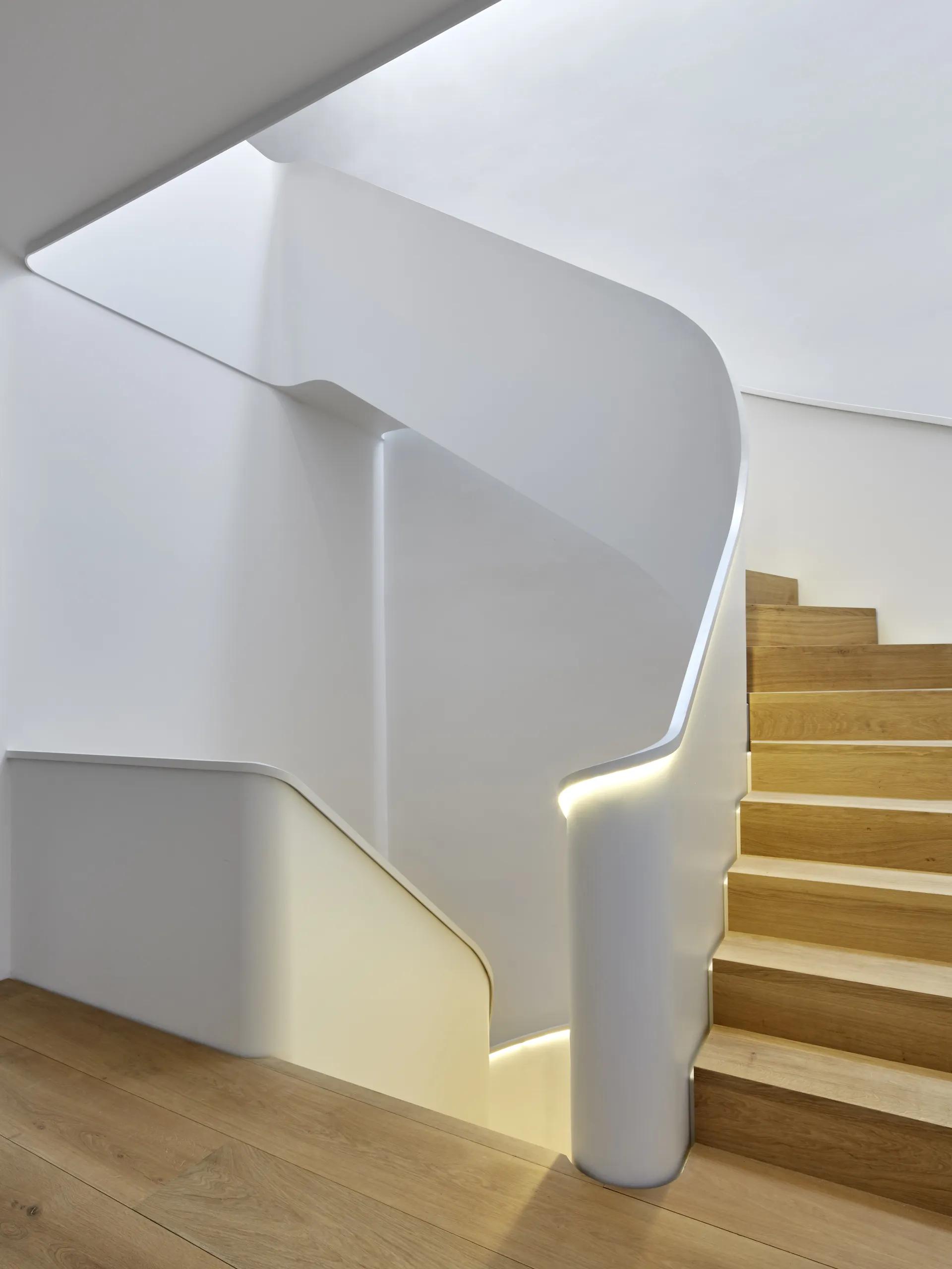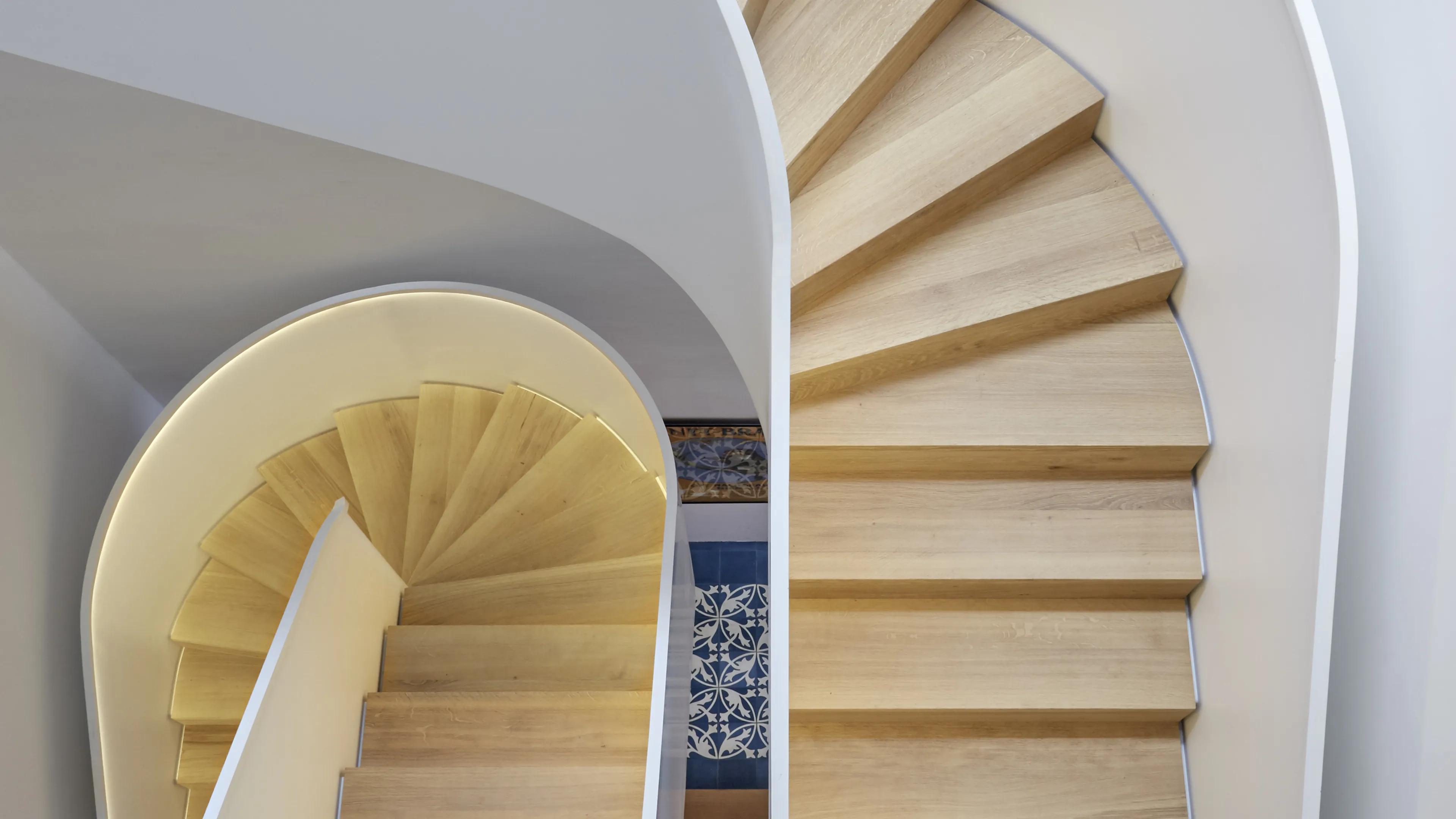 An extravagant floor plan with half- and quarter-turned flights and elegantly curved radii emphasises the slender architecture of the sculptural interior stairs in this historic villa.